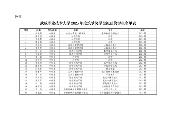 武威職業(yè)技術大學關于2025年度筑夢獎學金評選結果的公示