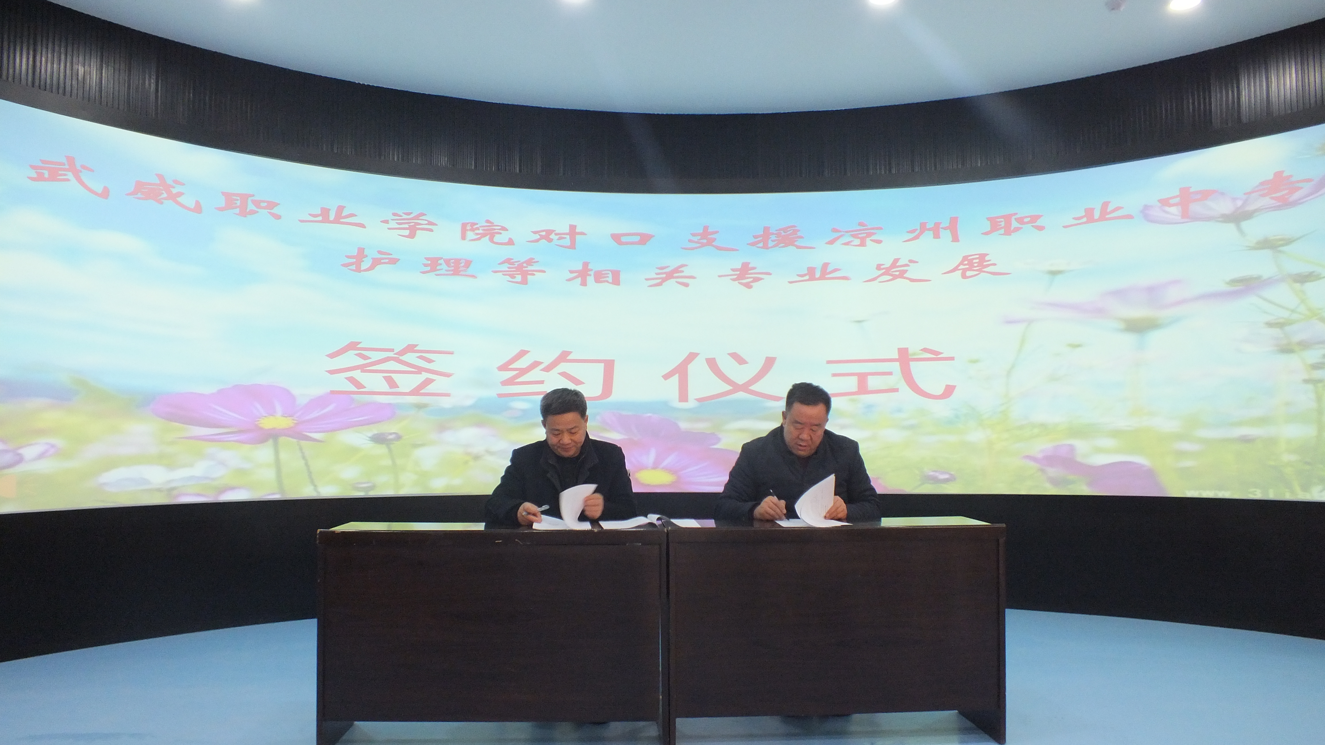 12月13日,學(xué)院與涼州區(qū)職業(yè)中專簽訂《武威職業(yè)學(xué)院對口支援涼州職業(yè)中專護(hù)理等相關(guān)專業(yè)發(fā)展協(xié)議》。學(xué)院黨委副書記趙明,涼州區(qū)職業(yè)中專校長何生玉,副校長張同禎、任鋒,學(xué)院護(hù)理系黨總支書記張建輝等參加了簽字儀式。
