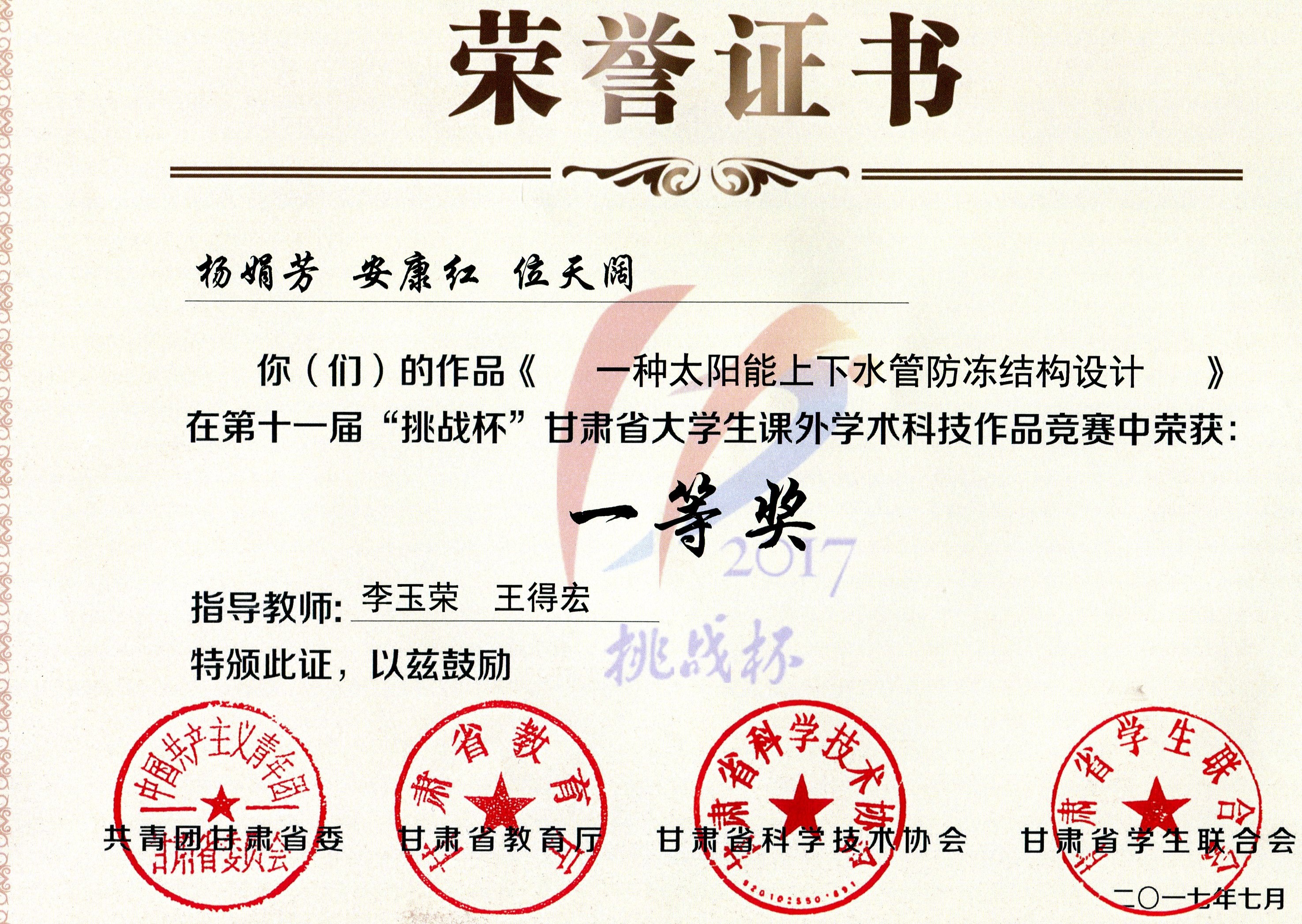 第十一屆“挑戰(zhàn)杯”甘肅省大學生課外學術科技作品競賽一等獎