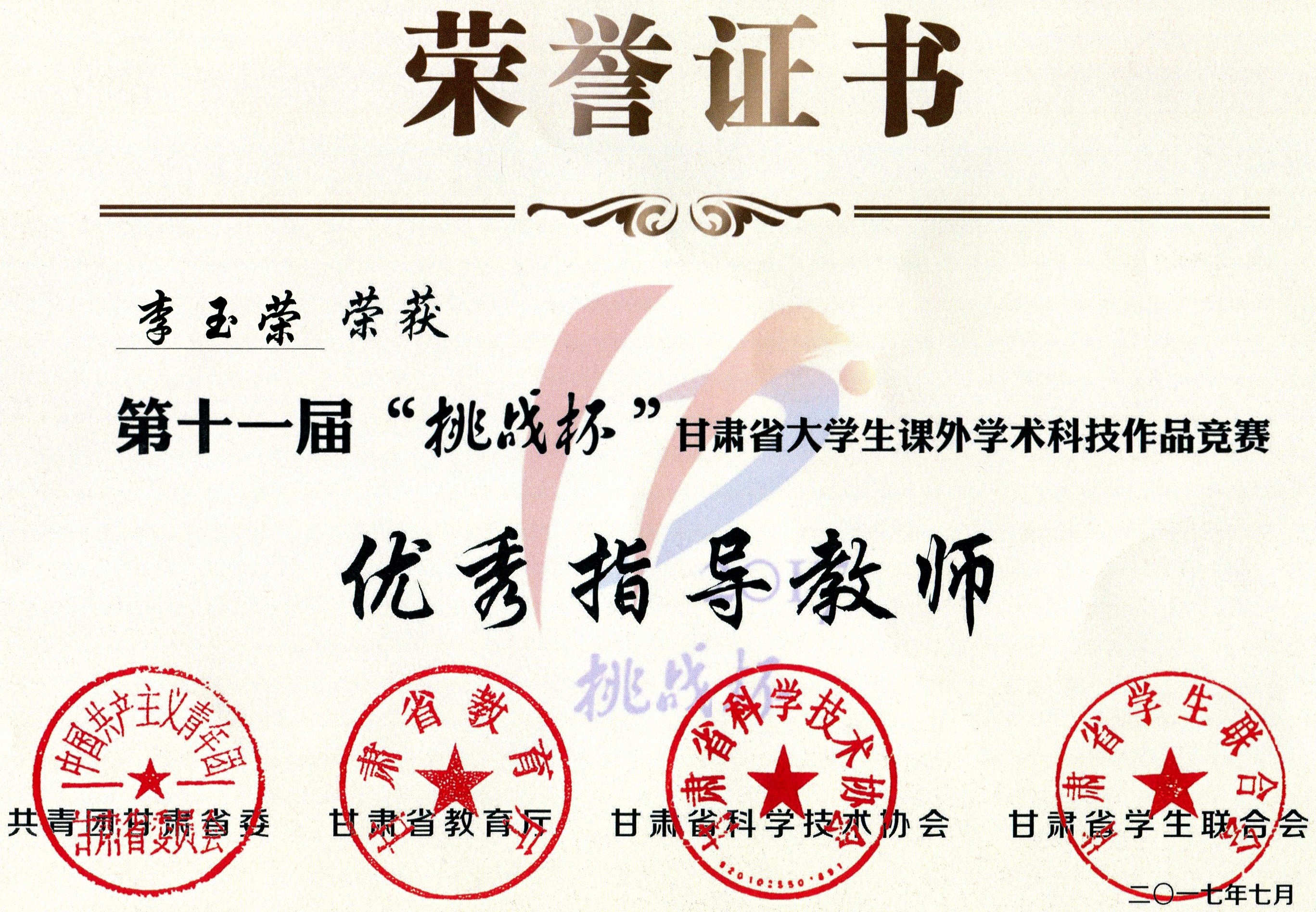 第十一屆“挑戰(zhàn)杯”甘肅省大學生課外學術(shù)科技作品競賽“優(yōu)秀指導教師”