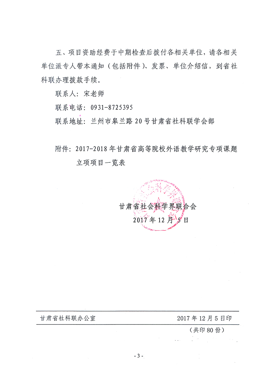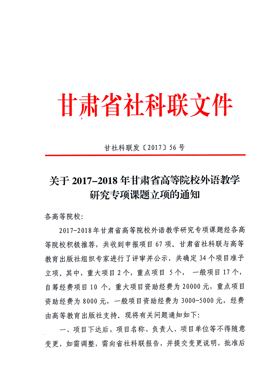 轉發(fā)甘肅省社科聯(lián)“關于2017-2018年甘肅省高等院校外語教學研究專項課題立項的通知”