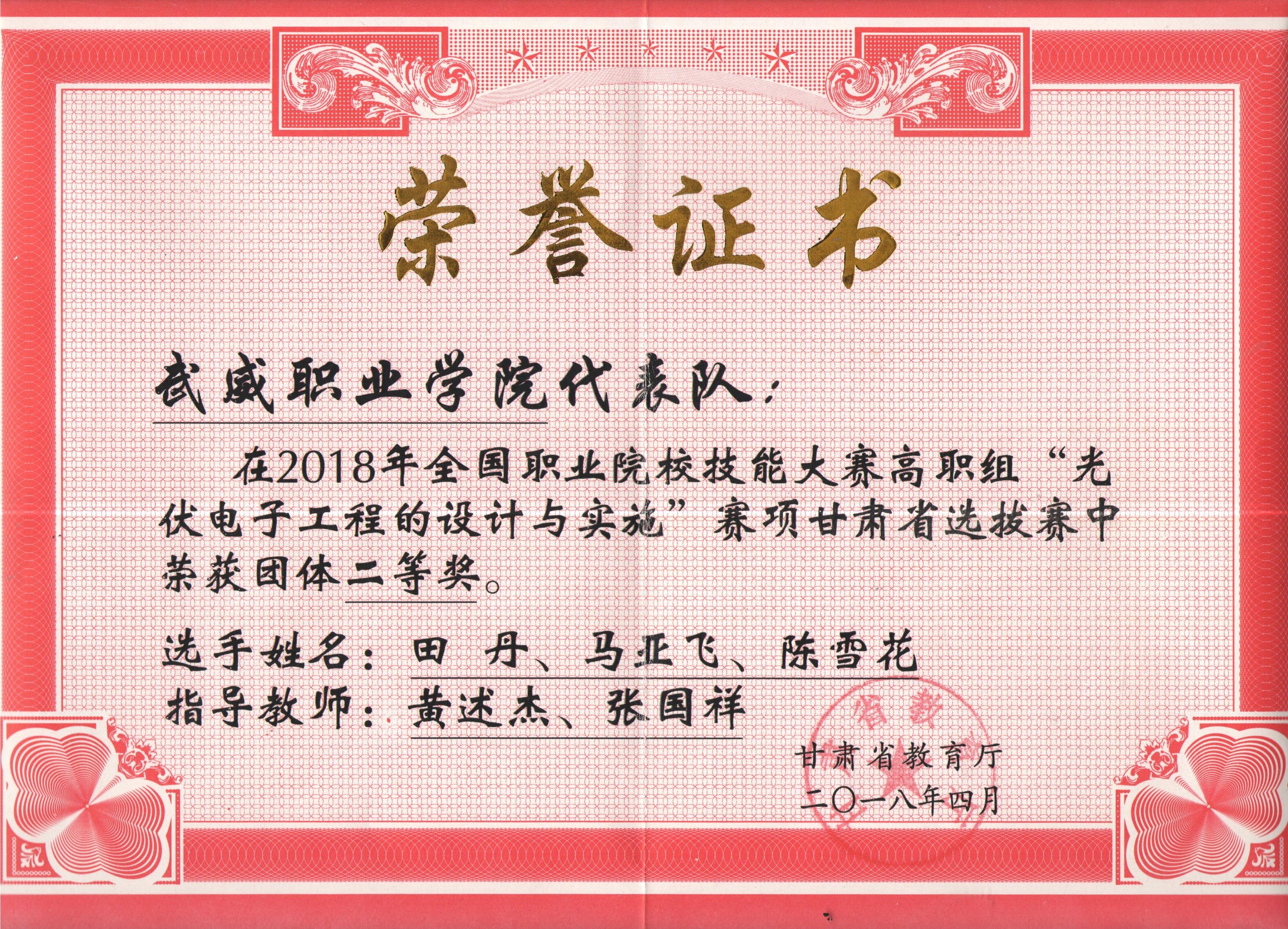 414日,2018年全國職業(yè)院校技能大賽“光伏電子工程的設計與實施”賽項甘肅省選拔賽在甘肅林業(yè)職業(yè)技術學院舉行。此次大賽有蘭州石化職業(yè)技術學院、甘肅林業(yè)職業(yè)技術學院、武威職業(yè)學院等6所院校的11支代表隊33名選手參加。由我院能源工程系黃述杰、張國祥老師指導,田丹、馬亞飛、陳雪花三名學生組成的武威職業(yè)學院一隊榮獲二等獎。