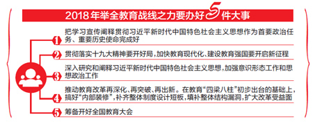 陳寶生在會(huì)議總結(jié)講話中強(qiáng)調(diào),新的一年,教育戰(zhàn)線要把握穩(wěn)中求進(jìn)的總基調(diào)、狠抓落實(shí)的總基點(diǎn)、攻堅(jiān)克難的總要求、“奮進(jìn)之筆”的總抓手,舉全教育戰(zhàn)線之力辦好幾件大事。一是把學(xué)習(xí)宣傳闡釋貫徹習(xí)近平新時(shí)代中國特色社會(huì)主義思想作為首要政治任務(wù)、重要?dú)v史使命完成好。二是貫徹落實(shí)十九大精神要開好局,加快教育現(xiàn)代化、建設(shè)教育強(qiáng)國要開啟新征程。三是深入研究和闡釋習(xí)近平新時(shí)代中國特色社會(huì)主義思想,加強(qiáng)意識(shí)形態(tài)工作和思想政治工作。四是推動(dòng)教育改革再深化、再突破、再出新。在教育“四梁八柱”初步出臺(tái)的基礎(chǔ)上,搞好“內(nèi)部裝修”,補(bǔ)齊整體制度設(shè)計(jì)短板,填補(bǔ)整體結(jié)構(gòu)漏洞,擴(kuò)大改革受益面。五是籌備開好全國教育大會(huì)。
