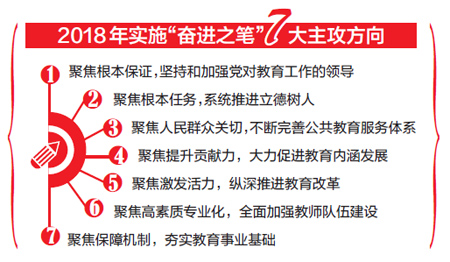 陳寶生指出,黨的十九大對(duì)教育工作作出了全面系統(tǒng)部署。在加快教育現(xiàn)代化、建設(shè)教育強(qiáng)國的新征程中,解決教育發(fā)展不平衡不充分的問題將是我們長(zhǎng)期要面對(duì)的工作主題。要以問題為導(dǎo)向,將其作為實(shí)施“奮進(jìn)之筆”的著力點(diǎn)和主攻方向。一是聚焦根本保證,堅(jiān)持和加強(qiáng)黨對(duì)教育工作的領(lǐng)導(dǎo)。要把黨的政治建設(shè)擺在首位,狠抓大抓基層黨組織建設(shè),持之以恒正風(fēng)肅紀(jì),抓好意識(shí)形態(tài)工作。二是聚焦根本任務(wù),系統(tǒng)推進(jìn)立德樹人。要把德育擺在更加重要的位置,堅(jiān)定青少年理想信念,改進(jìn)和加強(qiáng)思想政治工作,大力發(fā)展素質(zhì)教育,加強(qiáng)語言文字工作。三是聚焦人民群眾關(guān)切,不斷完善公共教育服務(wù)體系。要促進(jìn)學(xué)前教育普惠健康發(fā)展,加快城鄉(xiāng)義務(wù)教育一體化發(fā)展步伐,加大普及高中階段教育攻堅(jiān)力度,加大對(duì)困難地區(qū)扶持力度,切實(shí)加強(qiáng)校園安全。四是聚焦提升貢獻(xiàn)力,大力促進(jìn)教育內(nèi)涵發(fā)展。要以質(zhì)量為本,持續(xù)推進(jìn)職業(yè)教育質(zhì)量提升,健全高等教育內(nèi)涵發(fā)展政策機(jī)制,辦好繼續(xù)教育。五是聚焦激發(fā)活力,縱深推進(jìn)教育改革。要深化“放管服”改革,實(shí)施考招改革“拓展深化”攻堅(jiān)行動(dòng),支持和規(guī)范社會(huì)力量興辦教育,堅(jiān)定不移以開放促改革。六是聚焦高素質(zhì)專業(yè)化,全面加強(qiáng)教師隊(duì)伍建設(shè)。實(shí)施教師隊(duì)伍“建設(shè)改革”攻堅(jiān)行動(dòng),健全師德師風(fēng)建設(shè)長(zhǎng)效機(jī)制,完善教師管理制度,提升教師獲得感、幸福感和榮譽(yù)感。七是聚焦保障機(jī)制,夯實(shí)教育事業(yè)基礎(chǔ)。要落實(shí)教育投入責(zé)任,加快教育信息化步伐,全力推進(jìn)依法治教。