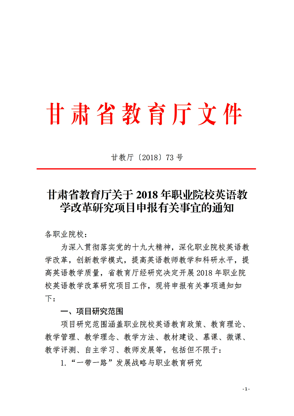 轉(zhuǎn)發(fā)甘肅省教育廳關(guān)于申報2018年職業(yè)院校英語教學(xué)改革研究項目的通知