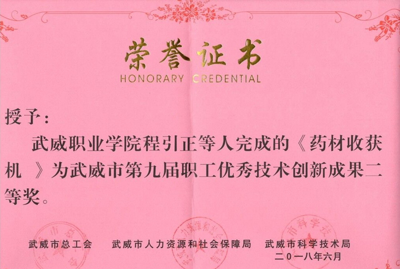 近日,武威市總工會(huì)、武威市人力資源和社會(huì)保障局、武威市科學(xué)技術(shù)局在全市企事業(yè)單位和廣大職工中廣泛開展了征集評選職工優(yōu)秀技術(shù)創(chuàng)新成果活動(dòng)。經(jīng)過逐級(jí)推薦、專家評審、網(wǎng)絡(luò)公示等程序,我系教師程引正等完成的《藥材收獲機(jī)》喜獲武威市第九屆職工優(yōu)秀技術(shù)創(chuàng)新成果二等獎(jiǎng)。