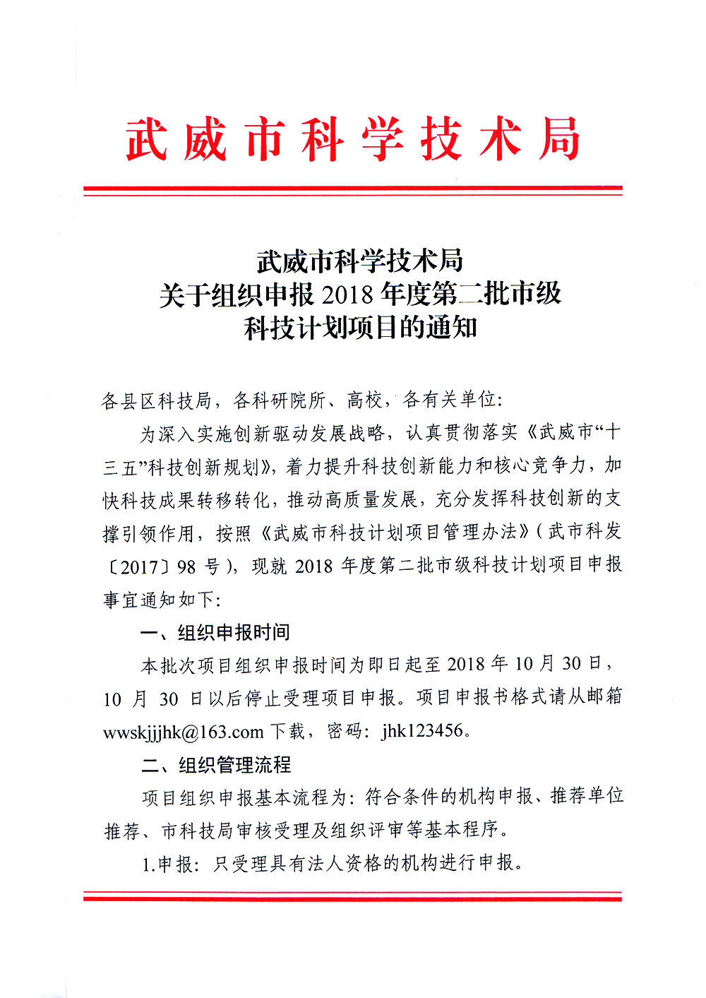 轉(zhuǎn)發(fā)武威市科學(xué)技術(shù)局關(guān)于組織申報2018年度第二批科技計劃項目的通知