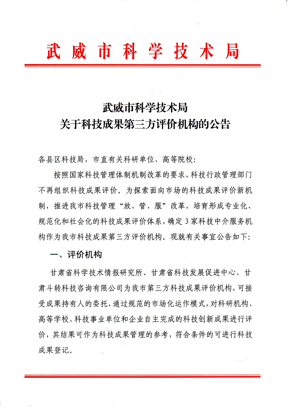 轉(zhuǎn)發(fā)武威市科學(xué)技術(shù)局關(guān)于科技成果第三方評價機構(gòu)的公告