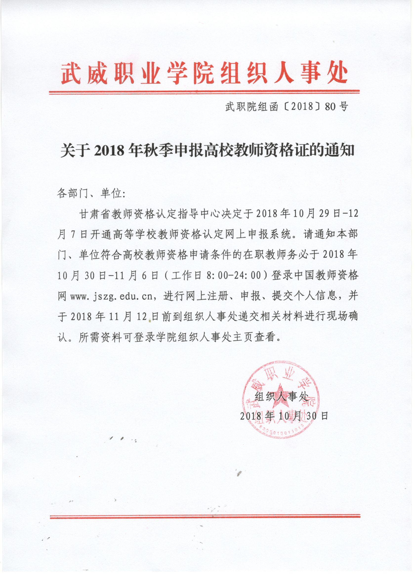 關(guān)于2018年秋季申報(bào)高校教師資格證的通知