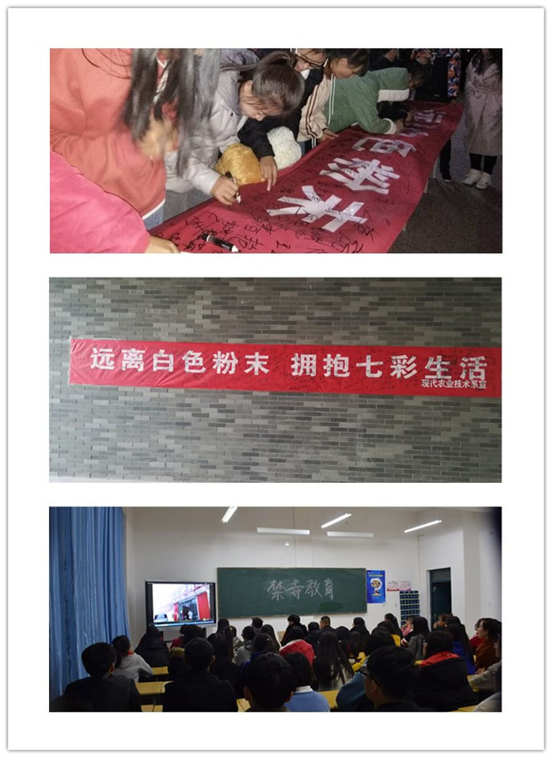 現(xiàn)代農(nóng)業(yè)技術(shù)系結(jié)合自身實(shí)際和條件,重點(diǎn)開展了以下活動(dòng)。一是通過在行樹樓張貼“遠(yuǎn)離白色粉末擁抱七彩生活”禁毒橫幅,號召全系師生創(chuàng)建和諧、文明、無毒的校園環(huán)境;二是各班開展了禁毒宣傳主題班會,宣傳毒品危害,普及防毒知識,警示大家珍愛生命,遠(yuǎn)離毒品;三是組織學(xué)生參加學(xué)院禁毒征文大賽,用語言表達(dá)禁毒的決心;四是團(tuán)學(xué)會組織各班同學(xué)網(wǎng)上參觀“中國禁毒數(shù)字展覽館”,觀看禁毒題材的優(yōu)秀微電影《一路有你》、《少年的秘密》、《蛻變》、《愛心帶你回家》,讓在場同學(xué)深刻感受到毒品的危害,堅(jiān)定了同學(xué)們禁毒防毒的信心。