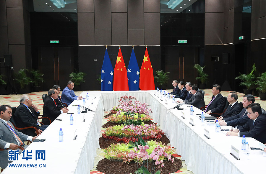 11月16日,國(guó)家主席習(xí)近平在莫爾茲比港分別會(huì)見建交太平洋島國(guó)領(lǐng)導(dǎo)人。這是習(xí)近平會(huì)見密克羅尼西亞聯(lián)邦總統(tǒng)克里斯琴。 新華社記者 龐興雷 攝