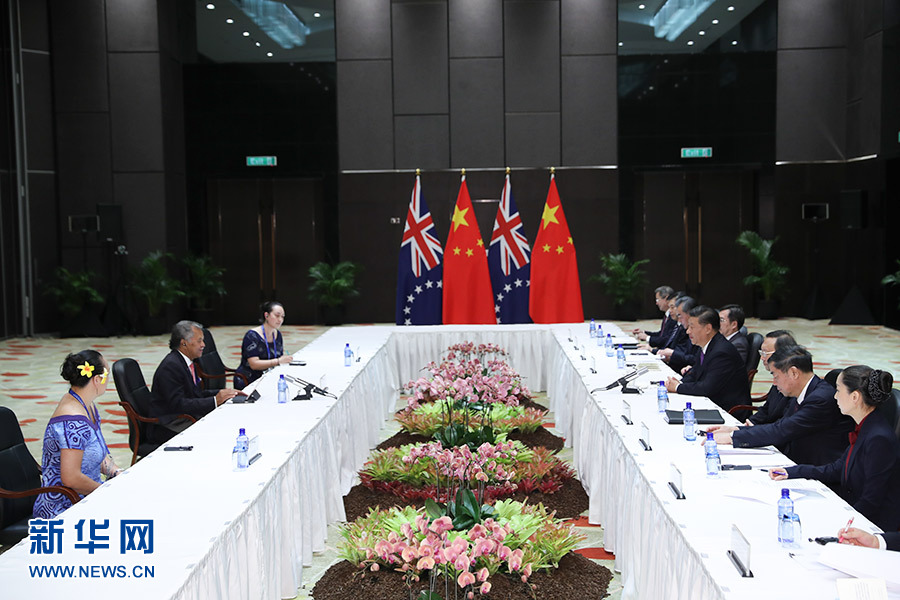 11月16日,國(guó)家主席習(xí)近平在莫爾茲比港分別會(huì)見建交太平洋島國(guó)領(lǐng)導(dǎo)人。這是習(xí)近平會(huì)見薩摩亞總理圖伊拉埃帕。 新華社記者 謝環(huán)馳 攝