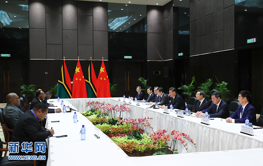 11月16日,國(guó)家主席習(xí)近平在莫爾茲比港分別會(huì)見建交太平洋島國(guó)領(lǐng)導(dǎo)人。這是習(xí)近平會(huì)見瓦努阿圖總理薩爾瓦伊。 新華社記者 謝環(huán)馳 攝