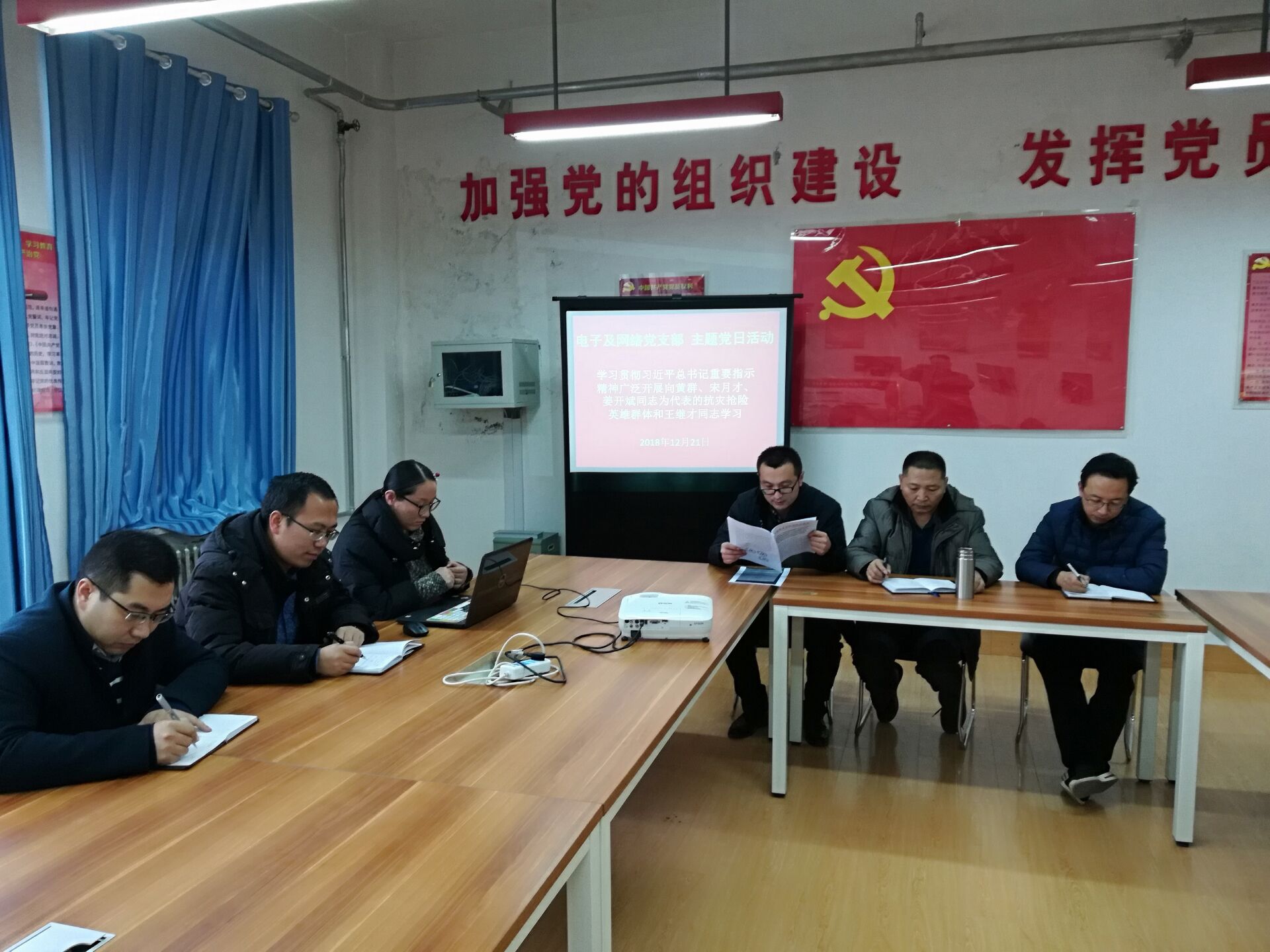 2018年12月21日,電子及網(wǎng)絡(luò)黨支部組織開展“不忘初心、牢記使命——學(xué)習(xí)全國(guó)、全省優(yōu)秀共產(chǎn)黨員先進(jìn)事跡”主題黨日活動(dòng),電子及網(wǎng)絡(luò)黨支部全體黨員參加學(xué)習(xí)。