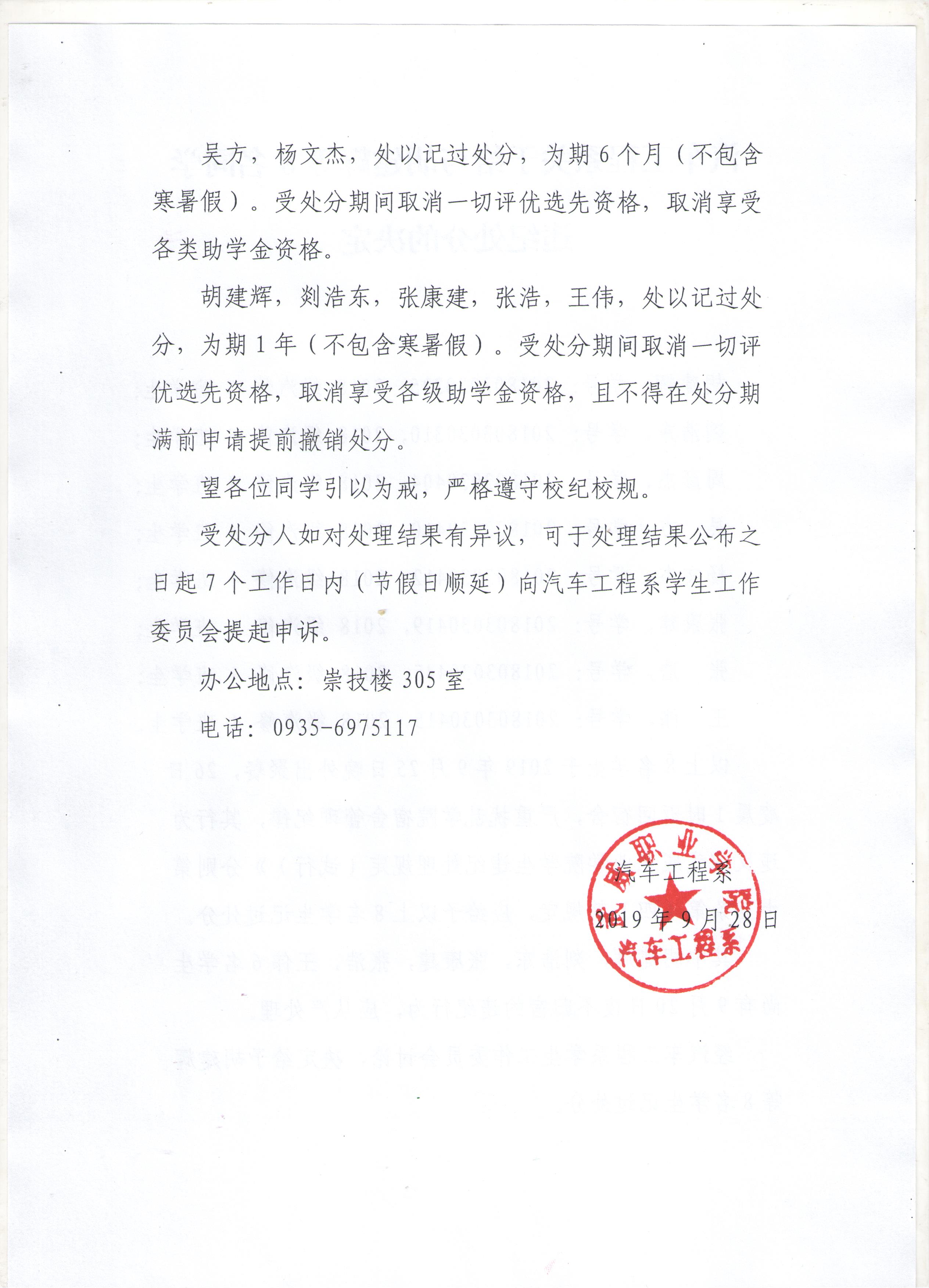 汽車工程系關于給與胡建輝等8名同學違紀處分的決定