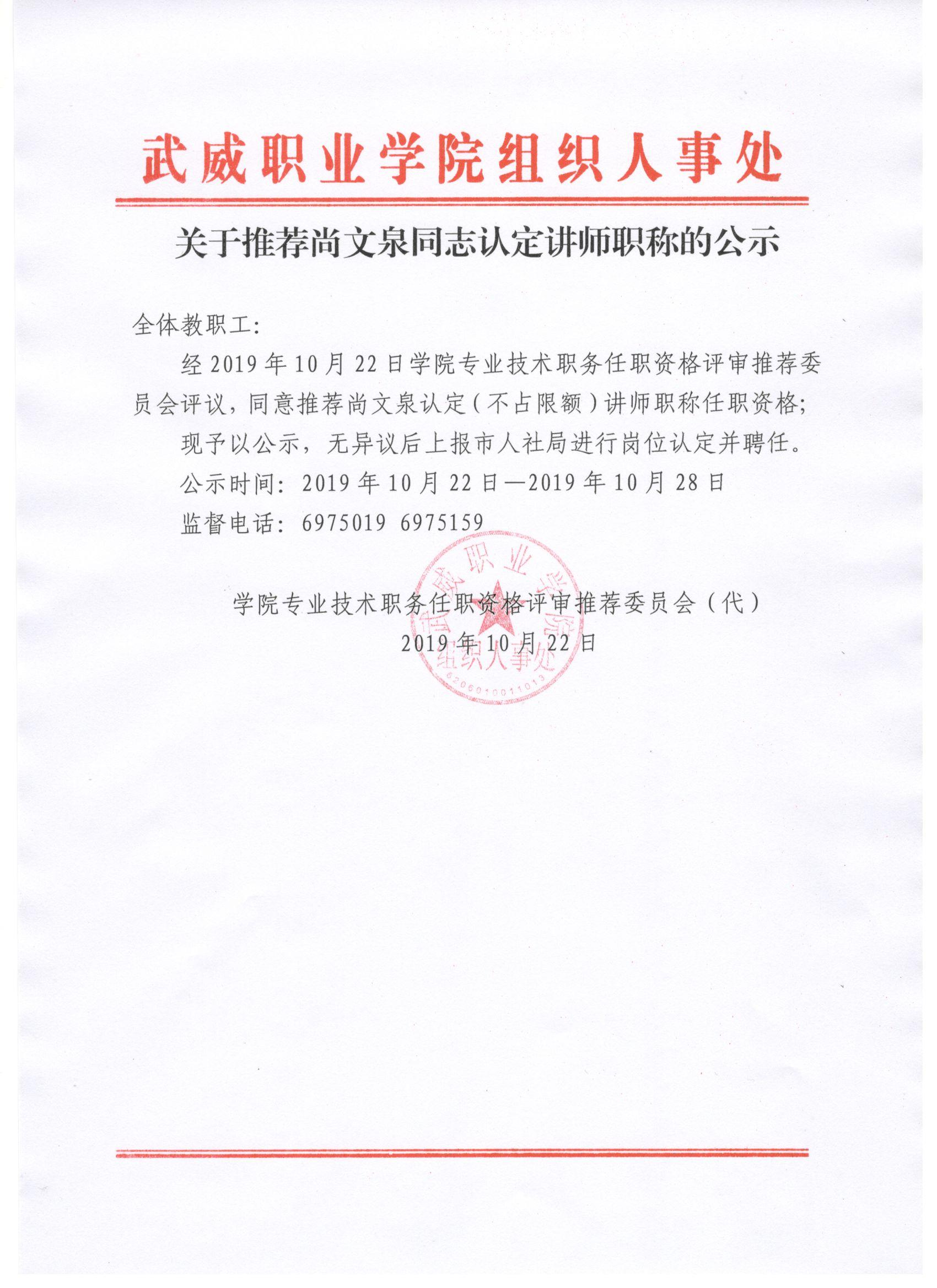 關于推薦尚文泉同志認定講師職稱的公示