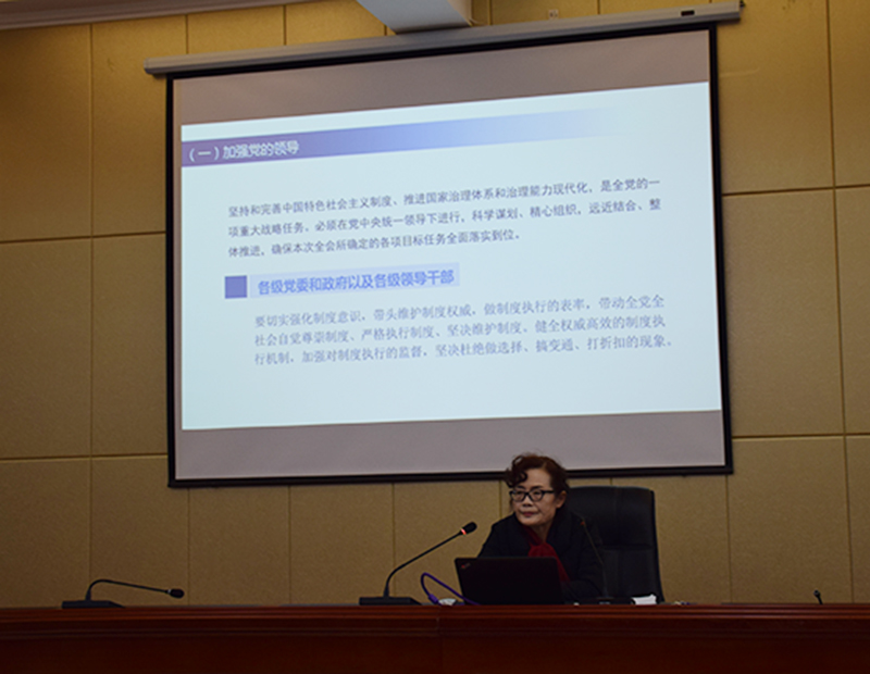 晏素珍以《中共中央關(guān)于堅(jiān)持和完善中國特色社會(huì)主義制度推進(jìn)國家治理體系和治理能力現(xiàn)代化若干重大問題的決定》的學(xué)習(xí)與解讀為題,重點(diǎn)就全會(huì)召開的背景、意義和看點(diǎn);《決定》的基本框架和主要內(nèi)容以及抓好全會(huì)的學(xué)習(xí)貫徹的具體要求進(jìn)行了宣講。要求廣大師生提高政治站位,樹牢“四個(gè)意識(shí)”,堅(jiān)定“四個(gè)自信”,做到“兩個(gè)維護(hù)”,推動(dòng)全會(huì)精神在全系落地生根、取得扎實(shí)成效。為實(shí)現(xiàn)“兩個(gè)一百年”奮斗目標(biāo),實(shí)現(xiàn)中華民族偉大復(fù)興的中國夢(mèng)而努力奮斗。
