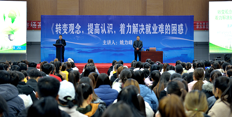 為貫徹2020屆全國普通高校畢業(yè)生就業(yè)創(chuàng)業(yè)工作網(wǎng)絡(luò)視頻會議精神,學(xué)院以習(xí)近平新時代中國特色社會主義思想為指導(dǎo),深入落實(shí)黨中央、國務(wù)院關(guān)于促進(jìn)高校畢業(yè)生就業(yè)創(chuàng)業(yè)的一系列重大決策部署,把畢業(yè)生就業(yè)工作擺在最突出位置,確保畢業(yè)生就業(yè)大局穩(wěn)定。12月14日上午,學(xué)院組織2020屆畢業(yè)生,在體育館參加了題為《轉(zhuǎn)變觀念,提高認(rèn)識,著力解決就業(yè)難得困惑》的專家講座,引導(dǎo)畢業(yè)生轉(zhuǎn)變觀念、積極就業(yè)。講座由省人社廳人力資源市場檔案管理部部長姚力峰主講,招生就業(yè)處副處長董鵬主持。