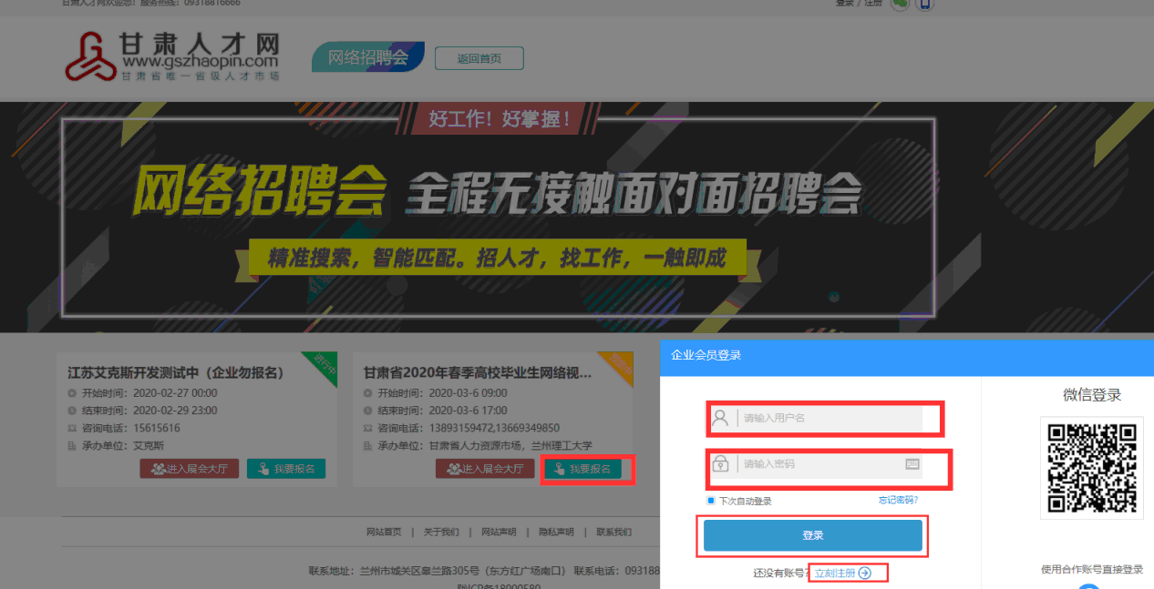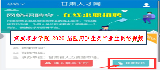 1.登錄甘肅人才網(wǎng)(www.gszhaopin.com),點(diǎn)擊菜單欄“招聘會(huì)”—“網(wǎng)絡(luò)招聘會(huì)”進(jìn)入二級(jí)頁面菜單,進(jìn)入網(wǎng)絡(luò)招聘會(huì)列表—選擇“武威職業(yè)學(xué)院2020屆醫(yī)藥衛(wèi)生類畢業(yè)生網(wǎng)絡(luò)視頻雙選會(huì)”點(diǎn)擊“我要報(bào)名”按鈕,登錄企業(yè)后臺(tái)(無賬號(hào)點(diǎn)擊“立即注冊”,資質(zhì)通過審核后再報(bào)名),待定審核。
