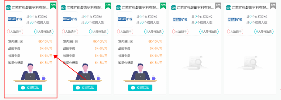 一是主動(dòng)在“新入場求職者”標(biāo)簽下,瀏覽入場求職人員簡歷,點(diǎn)擊“立即洽談”對意向洽談人員發(fā)出溝通申請,并進(jìn)行面試洽談。如下圖: