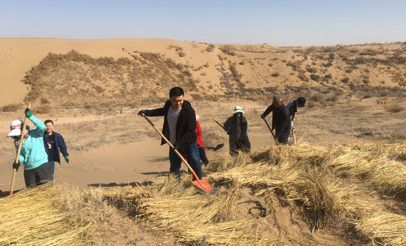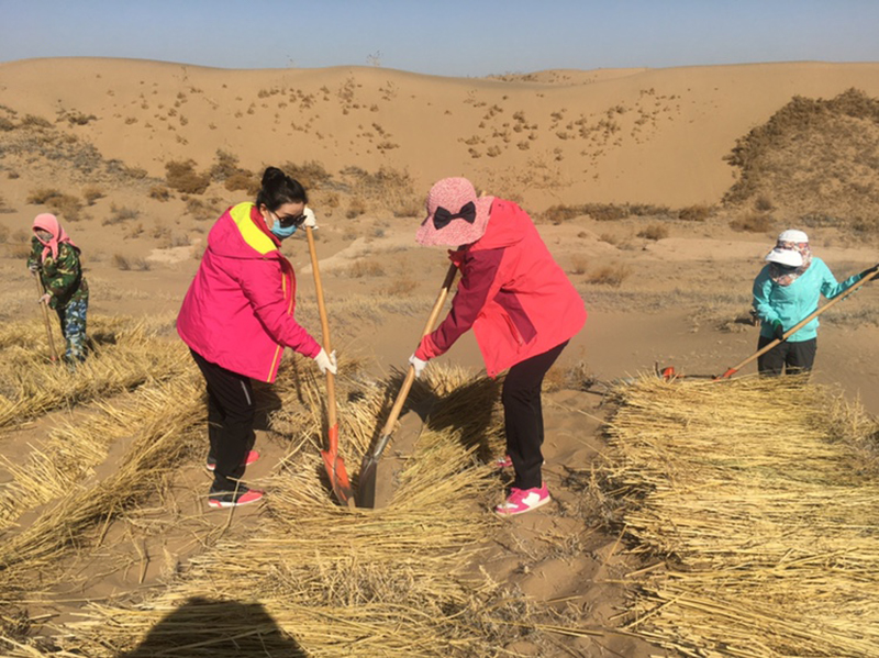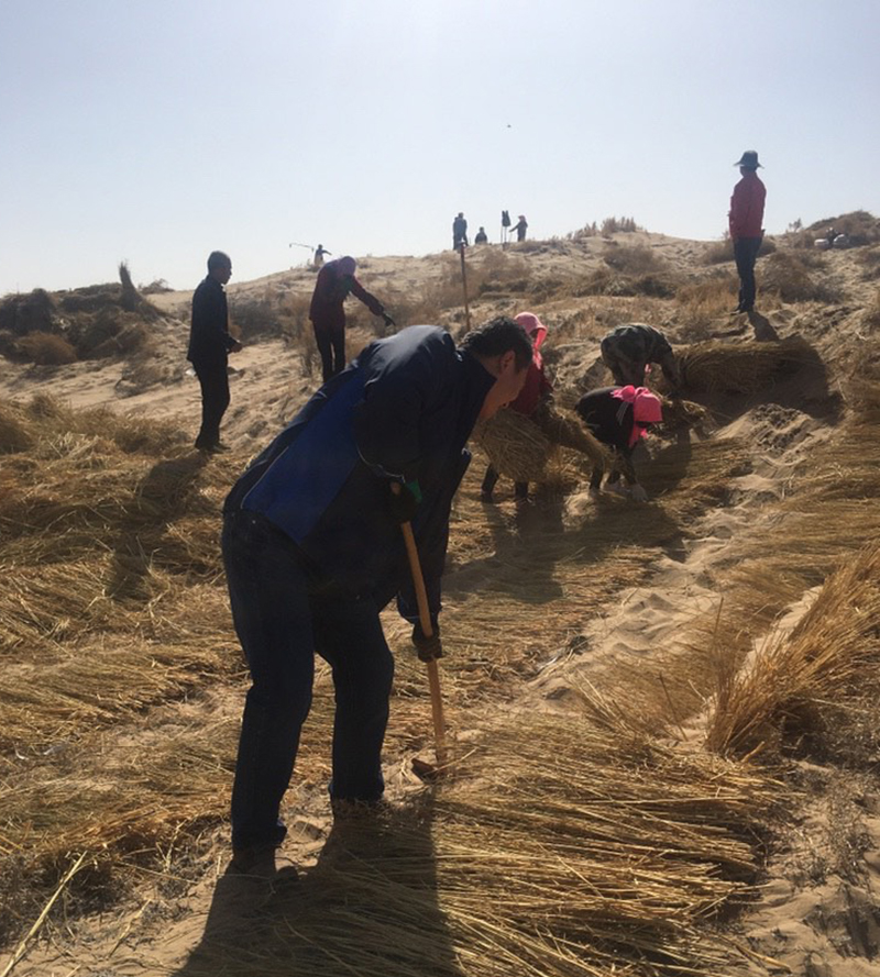 全體壓沙人員不怕吃苦、不怕流汗,爭先恐后投入壓沙勞動中。分工合作,有的開溝,有的鋪草,有的壓沙,整齊的麥草方格由一排排向一片片不斷延伸,一個(gè)個(gè)沙丘逐漸被麥草網(wǎng)格牢牢鎖住。