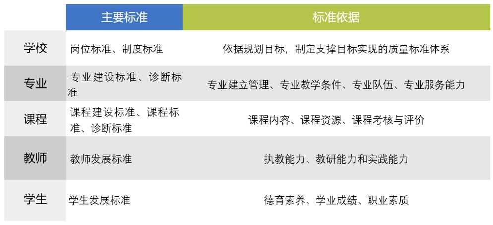 標(biāo)準(zhǔn)制定要體現(xiàn)多元質(zhì)量觀,采用剛性與柔性相結(jié)合的辦法,解決特色發(fā)展與創(chuàng)新發(fā)展的問(wèn)題,堅(jiān)持“目標(biāo)導(dǎo)向與問(wèn)題導(dǎo)向”的統(tǒng)一。從實(shí)際出發(fā),查找問(wèn)題、研究問(wèn)題、解決問(wèn)題,重點(diǎn)解決學(xué)校內(nèi)部治理中存在的“透明管理”等突出問(wèn)題;從專業(yè)建立管理、專業(yè)教學(xué)條件、專業(yè)隊(duì)伍、專業(yè)服務(wù)能力等維度制定專業(yè)建設(shè)標(biāo)準(zhǔn)和診斷標(biāo)準(zhǔn);從課程內(nèi)容、課程資源、課程考核與評(píng)價(jià)等維度制定課程建設(shè)標(biāo)準(zhǔn)、課程標(biāo)準(zhǔn)和課程診斷標(biāo)準(zhǔn);教師發(fā)展標(biāo)準(zhǔn)要以提升教師的執(zhí)教能力、教研能力和實(shí)踐能力為要素;學(xué)生發(fā)展標(biāo)準(zhǔn)要重點(diǎn)考慮學(xué)生的德育素養(yǎng)、學(xué)業(yè)成績(jī)、職業(yè)素質(zhì)。通過(guò)標(biāo)準(zhǔn)體系的打造,形成學(xué)校內(nèi)部質(zhì)量保證體系的標(biāo)準(zhǔn)鏈。