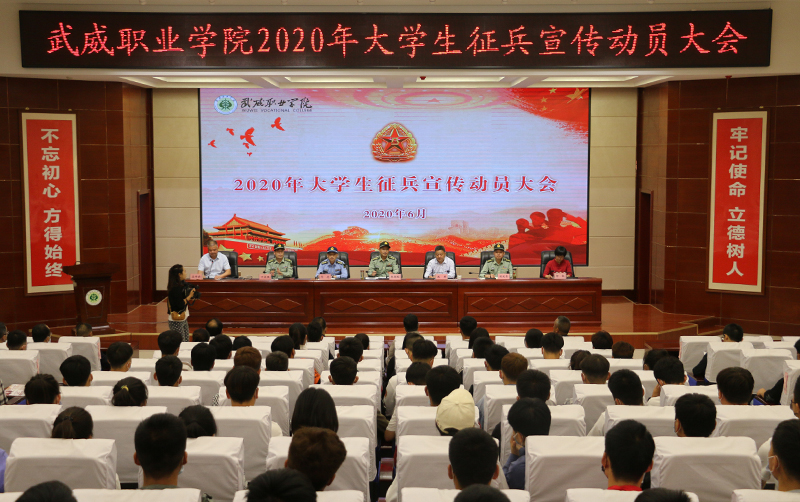 6月10日上午,學(xué)院2020年大學(xué)生征兵宣傳動(dòng)員大會(huì)在菁英廳舉行。武威軍分區(qū)司令員張國輝、武威軍分區(qū)動(dòng)員處處長劉忠、涼州區(qū)人武部部長闞延貴、涼州區(qū)人武部政委丁俊強(qiáng),學(xué)院黨委書記、院長趙明,副院長何毅出席會(huì)議。各院系負(fù)責(zé)人、輔導(dǎo)員和學(xué)生代表共200人參加了會(huì)議。會(huì)議由副院長王守云主持。