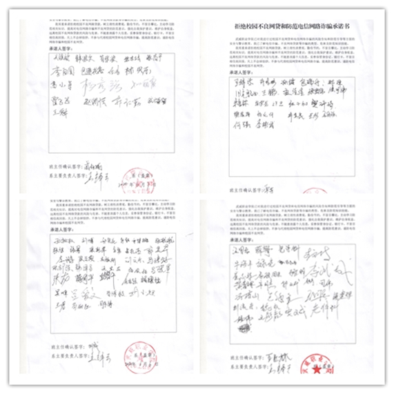 ??對(duì)學(xué)生進(jìn)行校園不良網(wǎng)貸和電信網(wǎng)絡(luò)詐騙的風(fēng)險(xiǎn)告知和防范引導(dǎo)等方面的安全與警示教育,讓學(xué)生了解電信詐騙、不良網(wǎng)絡(luò)貸款等詐騙的類型、危害及防范知識(shí)技能。自愿簽訂拒絕不良網(wǎng)貸和防范電信網(wǎng)絡(luò)詐騙承諾書(shū)。