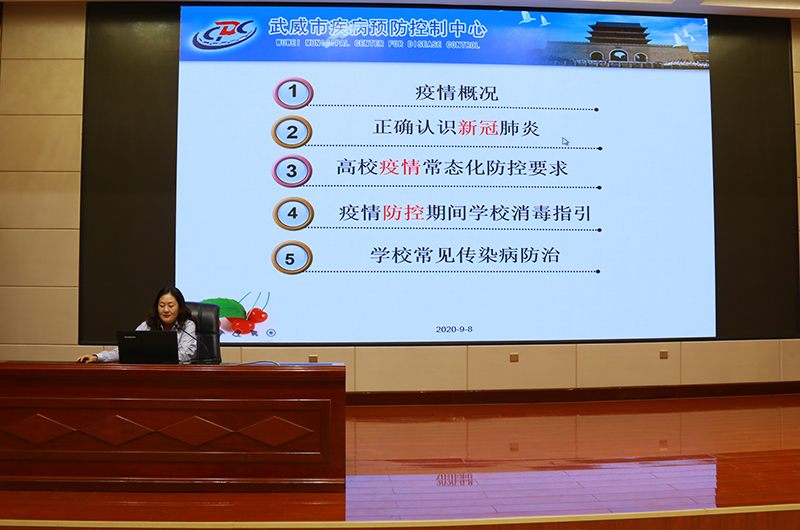 演練結(jié)束后,武威市疾控中心應急辦公室主任、副主任醫(yī)師馬艷在大學生活動中心菁英廳做了秋季開學疫情防控知識、技能培訓講座。