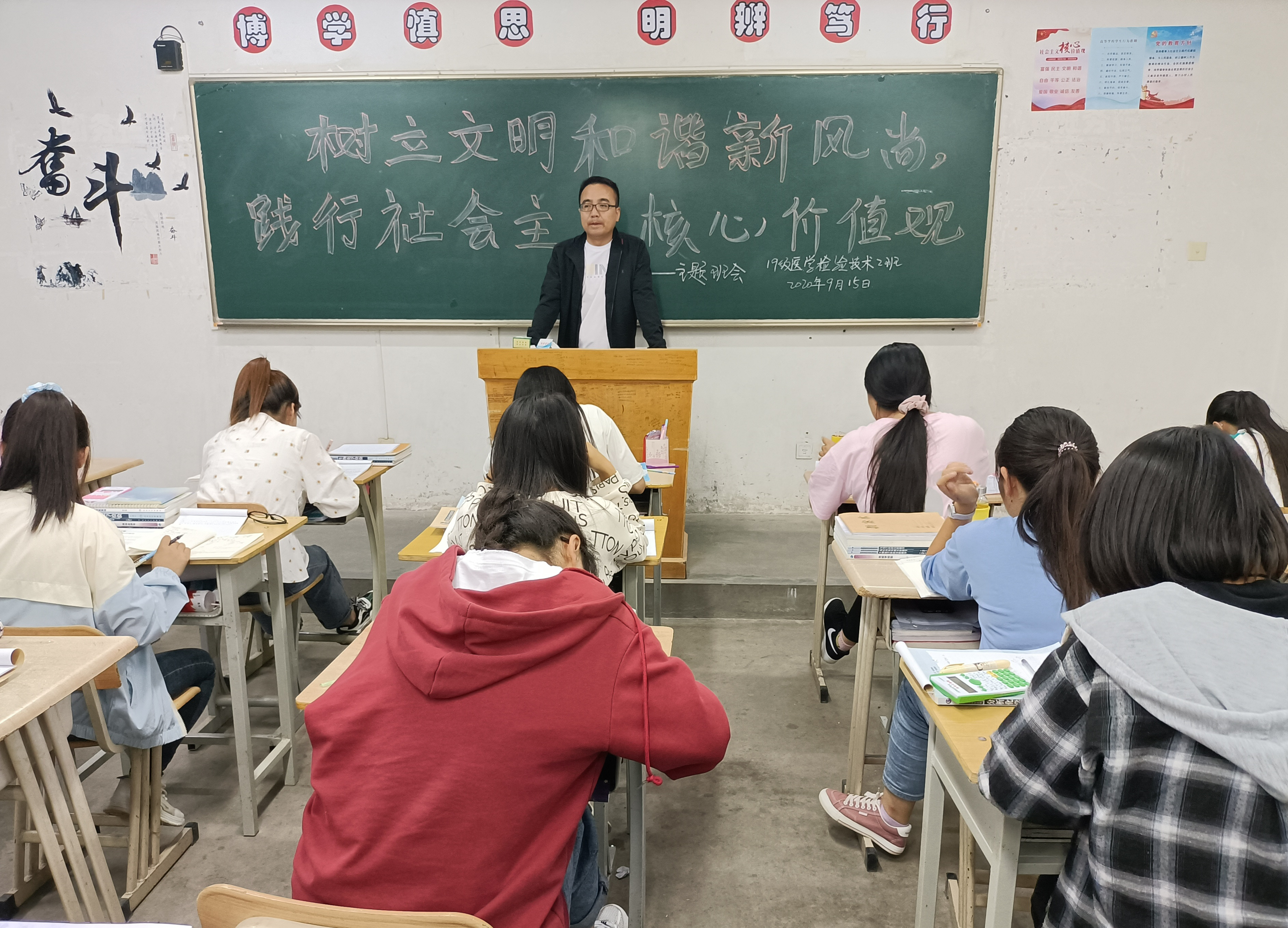 ?為深入學習習近平新時代中國特色社會主義思想和黨的十九大、十九屆四中全會精神,堅決落實學院關于文明校園和文明城市創(chuàng)建的各項安排部署,深入推進制止餐飲浪費行為系列活動,團結引領我系師生積極踐行社會主義核心價值觀,樹立文明和諧新風尚。醫(yī)學技術與信息管理系各教學班于2020年9月15日開展了“樹立文明新風尚,踐行社會主義核心價值觀”主題班會教育活動。