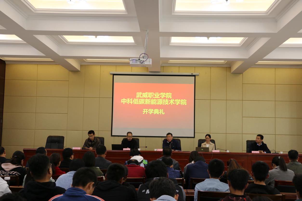 ??10月29日下午,中科低碳新能源技術學院在行樹樓北側報告廳召開2020級新生開學典禮。中國科學院先進核能創(chuàng)新研究院高級教育顧問、中科低碳新能源技術學院院長楊存忠教授,武威職業(yè)學院黨委副書記、中科低碳新能源技術學院副院長翟存祥教授,中國科學院上海應用物理研究所副研究員、中科低碳新能源技術學院院長助理米麗娟博士,中科低碳新能源技術學院合作辦學辦公室主任、能源工程系黨組織書記胡建宏教授,中科低碳新能源技術學院合作辦學辦公室副主任、能源工程系主任黃述杰副教授,中科低碳新能源技術學院全體教師及2020級新生參加了此次大會。會議由黃述杰主任主持。