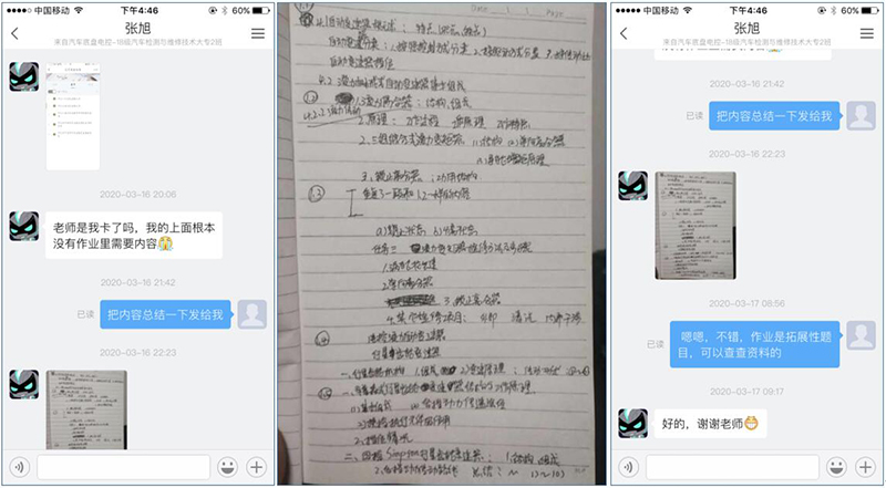 現(xiàn)代農(nóng)業(yè)技術(shù)系和汽車工程系的幾位學(xué)生春節(jié)前外出打工時(shí),因疫情爆發(fā)未能及時(shí)返回,被滯留當(dāng)?shù)?。疫情緩和后企業(yè)復(fù)工,學(xué)生為了能按時(shí)參加在線學(xué)習(xí),努力克服了時(shí)間不足、上網(wǎng)不便、網(wǎng)絡(luò)卡頓等諸多問題,白天工作、晚上學(xué)習(xí),刻苦的身影令人動(dòng)容。