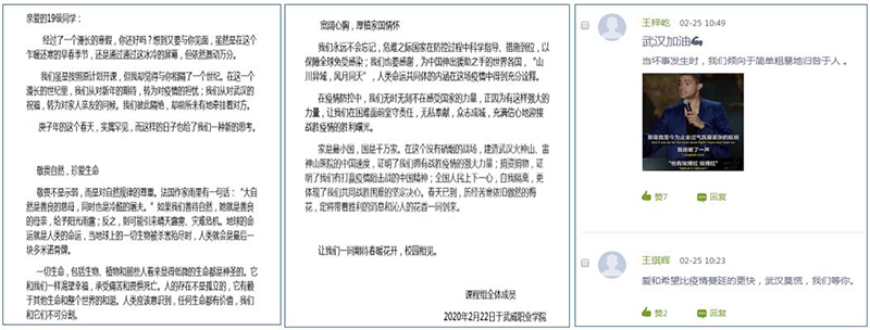 《中華優(yōu)秀傳統(tǒng)文化》課程團(tuán)隊(duì)的馮文娟老師在開學(xué)第一天借助在線教學(xué)平臺向?qū)W生推送了《致2019級學(xué)生的一封信》,激勵學(xué)生要敬畏自然、珍愛生命,致敬英雄、感恩榜樣,寬闊心胸、厚植家國情懷。信中這樣寫道:“在疫情防控中,我們無時無刻不在感受國家的力量,正因?yàn)橛羞@樣強(qiáng)大的力量,讓我們在困難面前堅(jiān)守責(zé)任,無私奉獻(xiàn),眾志成城,充滿信心地迎接戰(zhàn)勝疫情的勝利曙光?!薄?家是最小國,國是千萬家。在這個沒有硝煙的戰(zhàn)場,建造武漢火神山、雷神山醫(yī)院的中國速度,證明了我們擁有戰(zhàn)勝疫情的強(qiáng)大力量;捐資捐物,證明了我們有打贏疫情阻擊戰(zhàn)的中國精神;全國人民上下一心,自我隔離,更體現(xiàn)了我們共同戰(zhàn)勝困難的堅(jiān)定決心。春天已到,歷經(jīng)苦寒依舊傲然的梅花,定將帶著勝利的消息和沁人的花香一同到來?!蓖瑫r,為學(xué)生推送由央視頻和有道精品課共同錄制的《面對疫情教你如何有效防范》疫情防控專題視頻,與學(xué)生一起為打贏新冠肺炎疫情防控阻擊戰(zhàn)貢獻(xiàn)力量。