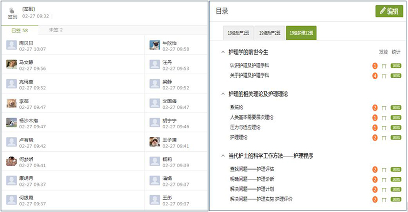 根據(jù)教學(xué)實(shí)際,護(hù)理制定了線上教學(xué)工作方案,對線上教學(xué)工作做出統(tǒng)一安排,強(qiáng)調(diào)了線上教學(xué)督導(dǎo)、任課教師和班主任的具體工作職責(zé)。2月24日,各項(xiàng)教學(xué)工作有序開展。共24名教師完成 11門課程的在線教學(xué)任務(wù),主要依托學(xué)院在線教學(xué)平臺、中國大學(xué)MOOC、人衛(wèi)慕課、智慧職教平臺上完成授課,上課學(xué)生1510人。通過多層次多方位的監(jiān)控數(shù)據(jù)分析,全系在線教學(xué)整體運(yùn)行平穩(wěn)有序,管理人員組織管理到位,教師盡職盡責(zé),課堂授課方式靈活多樣,學(xué)生積極互動,在線教學(xué)課堂效果良好,達(dá)到預(yù)期。學(xué)生平均到課率達(dá)到99%以上,積極落實(shí)了在線教學(xué)對學(xué)生“全覆蓋”的要求。教師在教學(xué)平臺上完成視頻、電子教材、PPT等資源上傳,積極開展課前預(yù)習(xí)、主題討論、隨堂測驗(yàn)、作業(yè)布置等各類線上課堂教學(xué)活動,充分調(diào)動學(xué)生的學(xué)習(xí)主動性,學(xué)習(xí)效果良好。