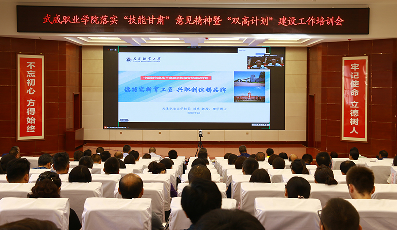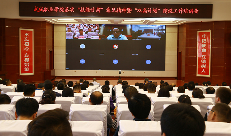 9月4日,學(xué)院在大學(xué)生活動(dòng)中心菁英廳召開了武威職業(yè)學(xué)院落實(shí)“技能甘肅”意見精神暨“雙高計(jì)劃”建設(shè)培訓(xùn)會(huì),黨委書記、院長(zhǎng)趙明主持會(huì)議并講話,黨委副書記翟存祥,黨委委員、副院長(zhǎng)王永緒、田迎春、何毅,黨委委員、紀(jì)委書記、監(jiān)察專員陳曉煜,黨委委員、副院長(zhǎng)王守云出席會(huì)議。全體中層干部、專業(yè)帶頭人、課程負(fù)責(zé)人和教師代表共計(jì)220人參加了會(huì)議。
