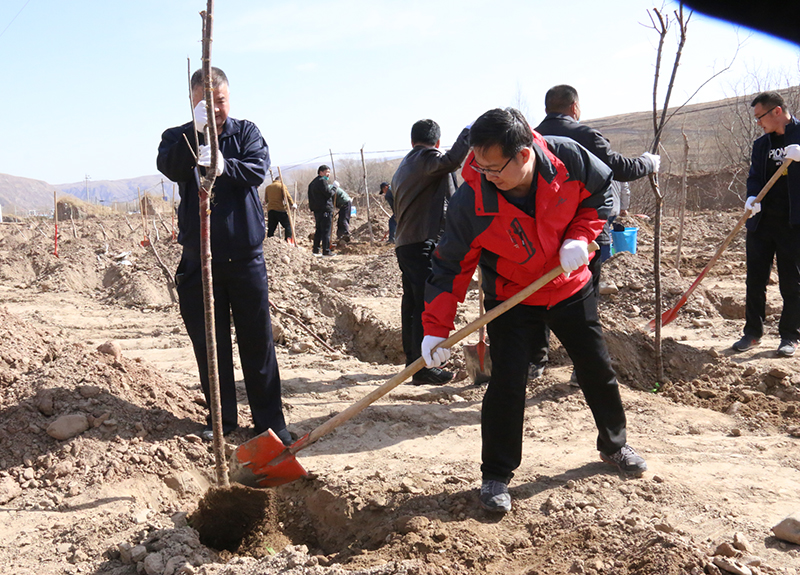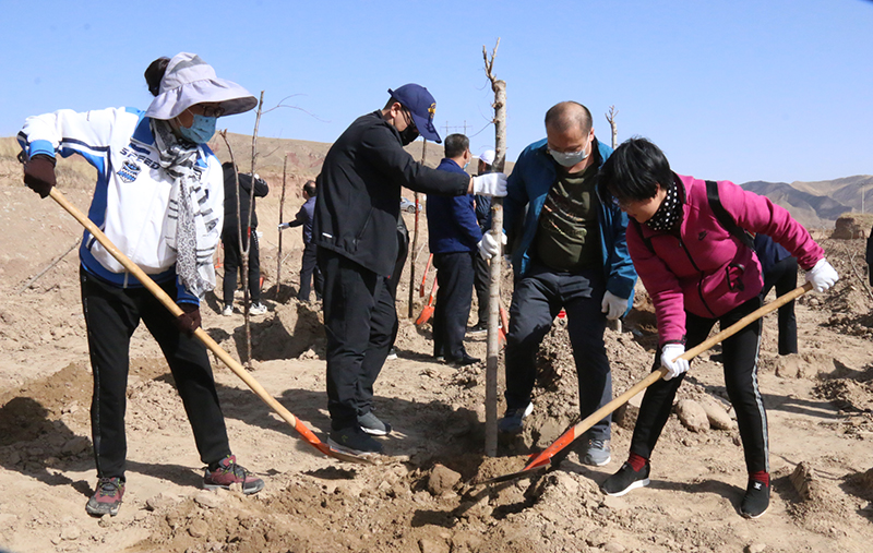 春風(fēng)吹拂處,新綠綻枝頭。為深入學(xué)習(xí)貫徹習(xí)近平總書記視察甘肅的重要講話和批示精神,認(rèn)真踐行綠水青山就是金山銀山的發(fā)展理念,實(shí)施綠色發(fā)展戰(zhàn)略,進(jìn)一步加強(qiáng)祁連山生態(tài)環(huán)境保護(hù)與治理,幫助幫扶鎮(zhèn)打贏脫貧攻堅(jiān)戰(zhàn),實(shí)施鄉(xiāng)村振興戰(zhàn)略,4月9日,學(xué)院領(lǐng)導(dǎo)班子成員、幫扶干部、駐村干部及部分教職工70多人深入結(jié)對幫扶鎮(zhèn)——黑松驛鎮(zhèn)開展義務(wù)植樹活動(dòng),建設(shè)“生態(tài)示范林”。春光沐浴的祁連山腳下黑松驛鎮(zhèn),春意盎然,生機(jī)勃勃,正是植樹好時(shí)節(jié)。廣大教職工一下車就拿起鐵鍬到植樹現(xiàn)場,與黑松驛鎮(zhèn)政府部分干部一起投入植樹活動(dòng),按照“橫看直線側(cè)一線、三埋兩踩一提苗”的技術(shù)要求,三人一組,分工協(xié)作,有序配合,揮鍬培土、扶苖踩土、圍堰澆水,現(xiàn)場一派熱火朝天的勞動(dòng)景象。當(dāng)天植樹育林約20余畝,一棵棵新栽的樹苗整齊排列,迎風(fēng)挺立。通過義務(wù)植樹,廣大教職工用實(shí)際行動(dòng)傳播著生態(tài)文明、綠色發(fā)展理念,切實(shí)幫助幫扶鎮(zhèn)綠起來,美起來,富起來。