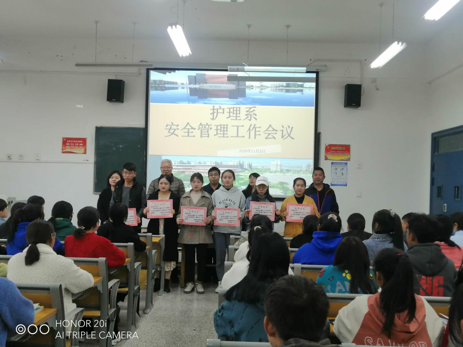 會(huì)上,陳鳳平宣讀了《護(hù)理系關(guān)于表彰2019-2020學(xué)年度學(xué)生優(yōu)秀安全管理員的決定》,護(hù)理系書記張建輝為獲表彰學(xué)生頒發(fā)榮譽(yù)證書。張學(xué)軍就近期我系存在的安全隱患問題作了詳細(xì)的說明。張建輝傳達(dá)了學(xué)院召開的疫情常態(tài)化防控工作會(huì)議內(nèi)容及相關(guān)文件精神,他指出,全系要進(jìn)一步加強(qiáng)安全隱患排查,尤其是實(shí)驗(yàn)室安全,切實(shí)將安全各項(xiàng)工作措施落到實(shí)處,預(yù)防安全事故的發(fā)生。他強(qiáng)調(diào),全系師生要進(jìn)一步加強(qiáng)學(xué)生身體健康監(jiān)測(cè),尤其是每天的晨午檢、日?qǐng)?bào)告、零報(bào)告,切實(shí)將疫情防控各項(xiàng)工作措施落到實(shí)處;倡導(dǎo)文明就餐,增強(qiáng)節(jié)約意識(shí),實(shí)施“光盤行動(dòng)”,杜絕浪費(fèi)發(fā)生; 持續(xù)做好宿舍、教室及環(huán)境衛(wèi)生掃除,營(yíng)造良好的學(xué)習(xí)、生活和工作環(huán)境;安全是所有工作的基礎(chǔ)與保障,全體安全員要齊心協(xié)力、攜手努力,除隱患、防火險(xiǎn)、保安全、促和諧,為建設(shè)美好校園戮力奮進(jìn)。