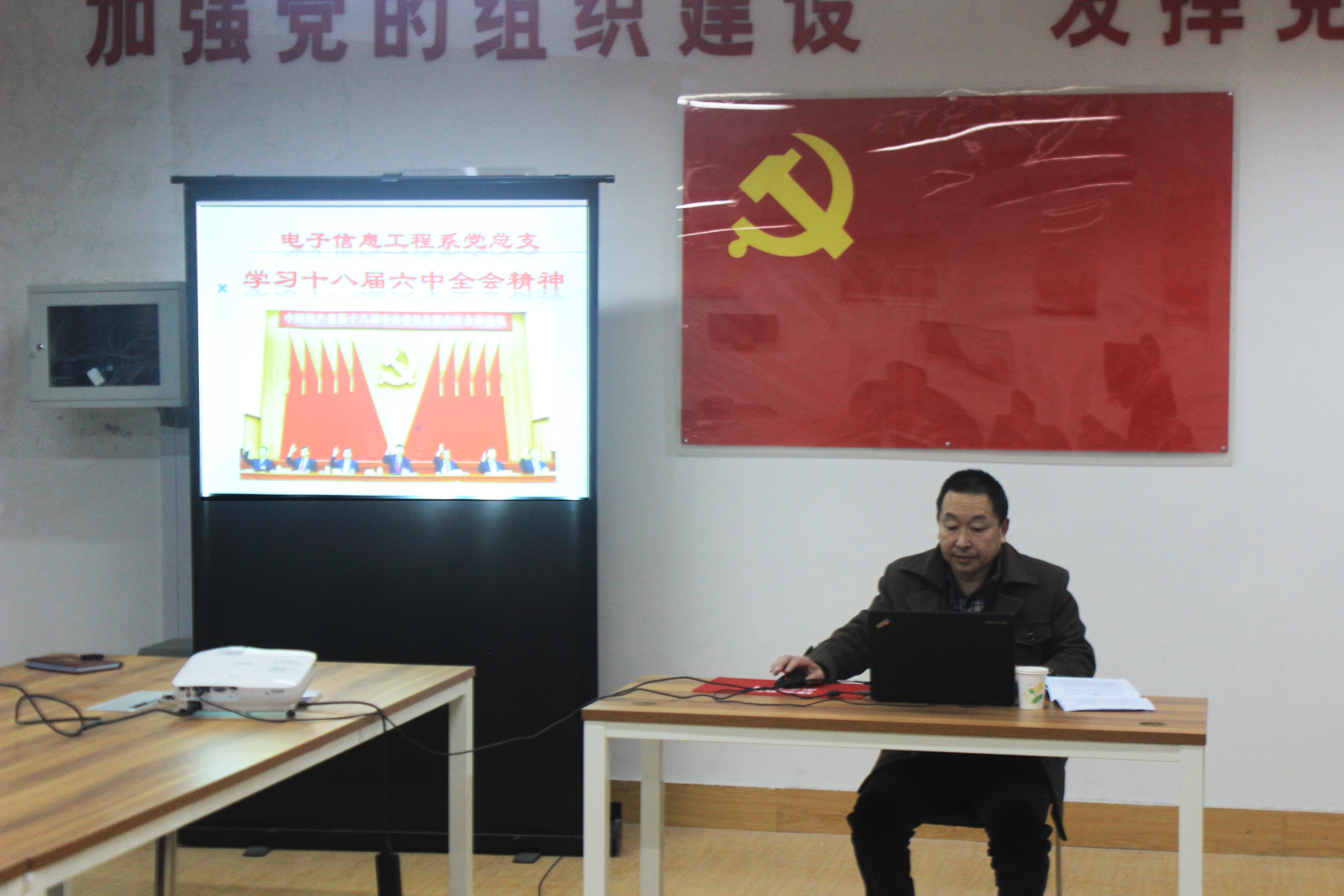 為認(rèn)真學(xué)習(xí)領(lǐng)會(huì)黨的十八屆六中全會(huì)重要精神,全面加強(qiáng)我系黨的建設(shè),更好地推動(dòng)我系各項(xiàng)工作開展,按照學(xué)院《關(guān)于開展十八屆六中全會(huì)精神宣講的通知》要求,電子信息工程系于1月4日邀請(qǐng)人文藝術(shù)教育系劉心副教授進(jìn)行了十八屆六中全會(huì)精神宣講。會(huì)議由系黨總支書記袁青年同志主持,全體教師及學(xué)生入黨積極分子參加了宣講會(huì)。