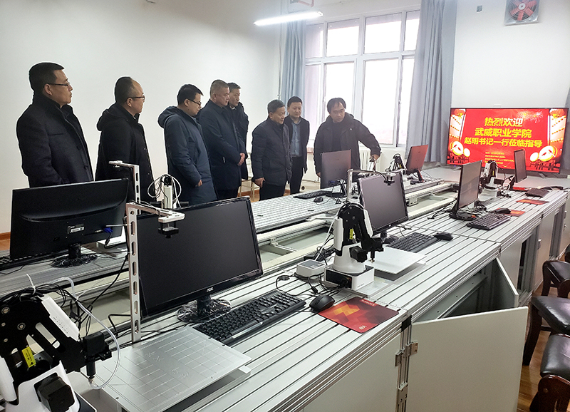 在韓九強團隊實驗室,工作小組聆聽了韓九強教授視頻講座,并實地考察交流了人工智能技術(shù)發(fā)展。趙明就高職院校人工智能相關(guān)專業(yè)開設(shè)與專業(yè)發(fā)展前景同韓九強進行了深入交流。