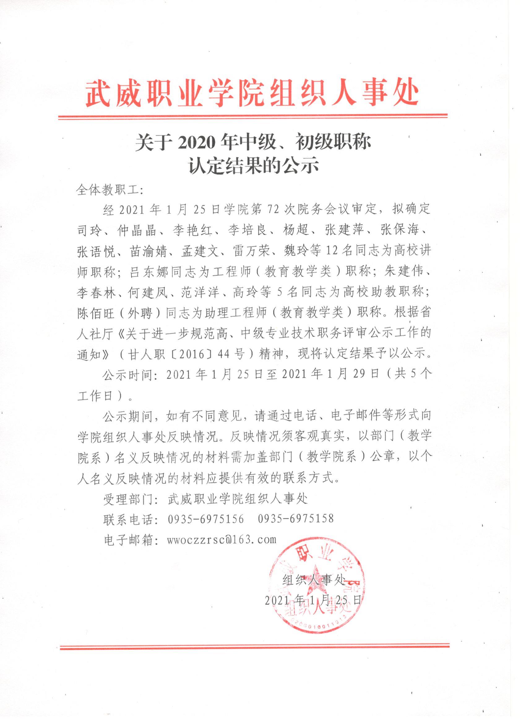 關(guān)于2020年中級(jí)、初級(jí)職稱(chēng)認(rèn)定結(jié)果的公示