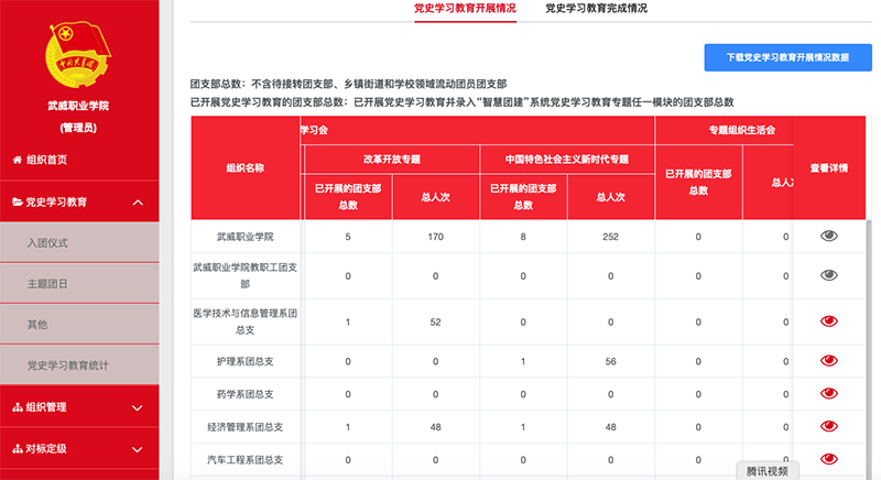 通過(guò)智慧團(tuán)建黨史學(xué)習(xí)教育專區(qū),可以更好的實(shí)現(xiàn)對(duì)團(tuán)組織、團(tuán)干部、團(tuán)員黨史學(xué)習(xí)教育情況的動(dòng)態(tài)采集,構(gòu)建全團(tuán)大數(shù)據(jù)統(tǒng)計(jì),及時(shí)掌握各級(jí)團(tuán)組織和團(tuán)員學(xué)習(xí)教育整體進(jìn)度,有針對(duì)性地做好監(jiān)督,實(shí)現(xiàn)對(duì)團(tuán)員團(tuán)干部的網(wǎng)絡(luò)化黨史學(xué)習(xí)指導(dǎo)管理,實(shí)時(shí)掌握?qǐng)F(tuán)員需求,創(chuàng)新活動(dòng)載體,切實(shí)推動(dòng)我院共青團(tuán)黨史學(xué)習(xí)教育活動(dòng)扎實(shí)開(kāi)展。