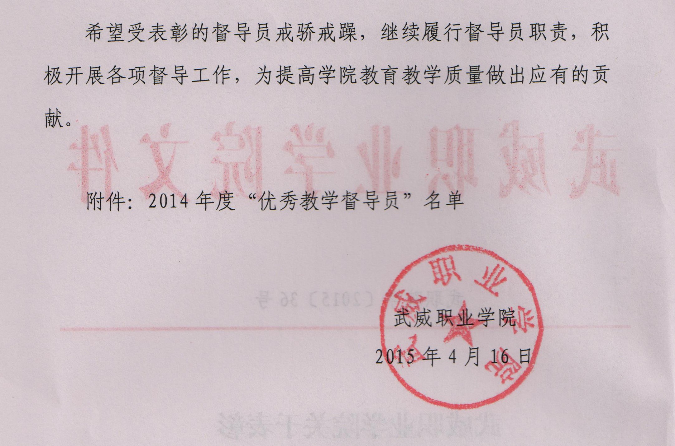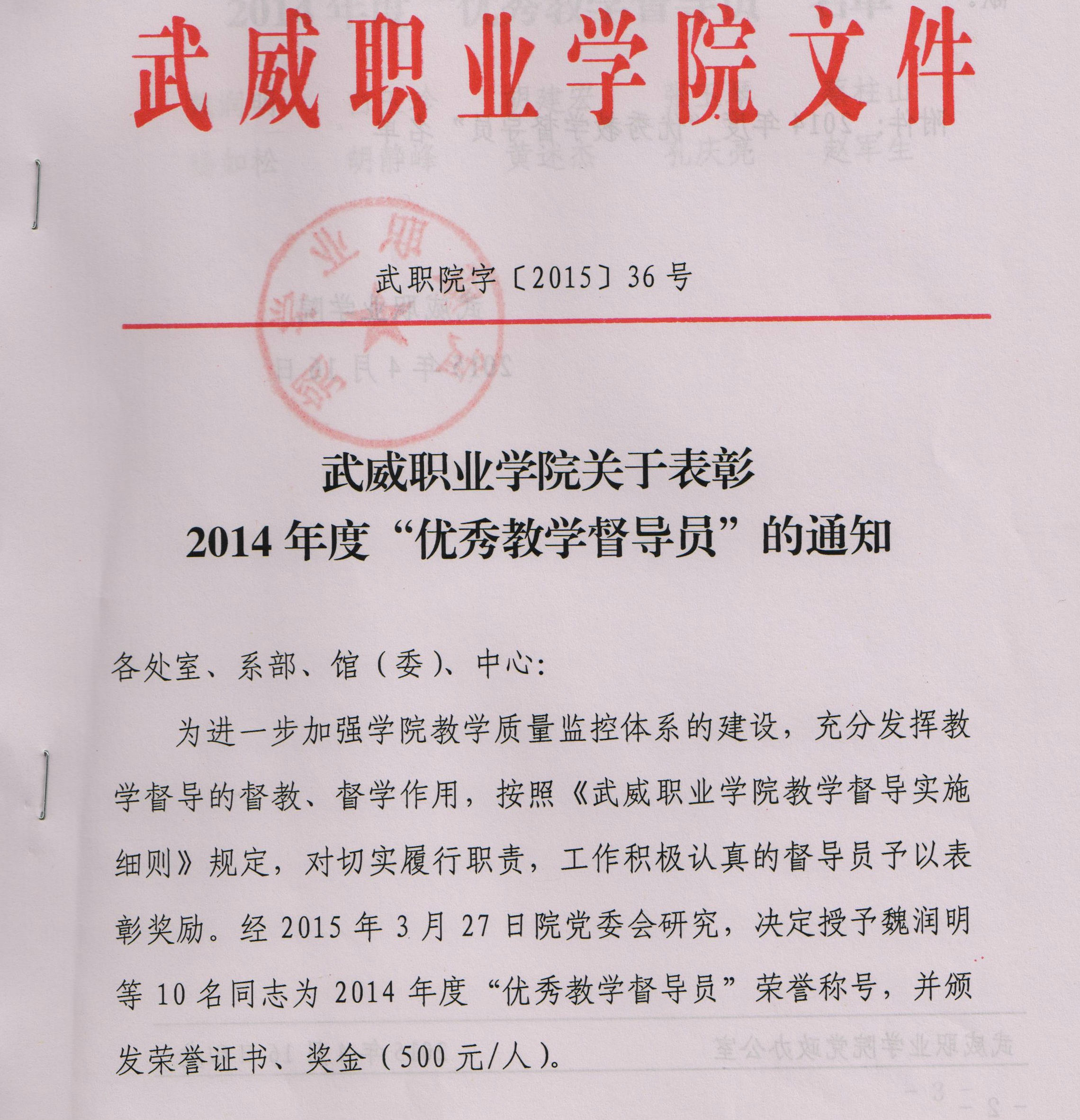 關(guān)于表彰2014年度“優(yōu)秀教學督導員”的決定
