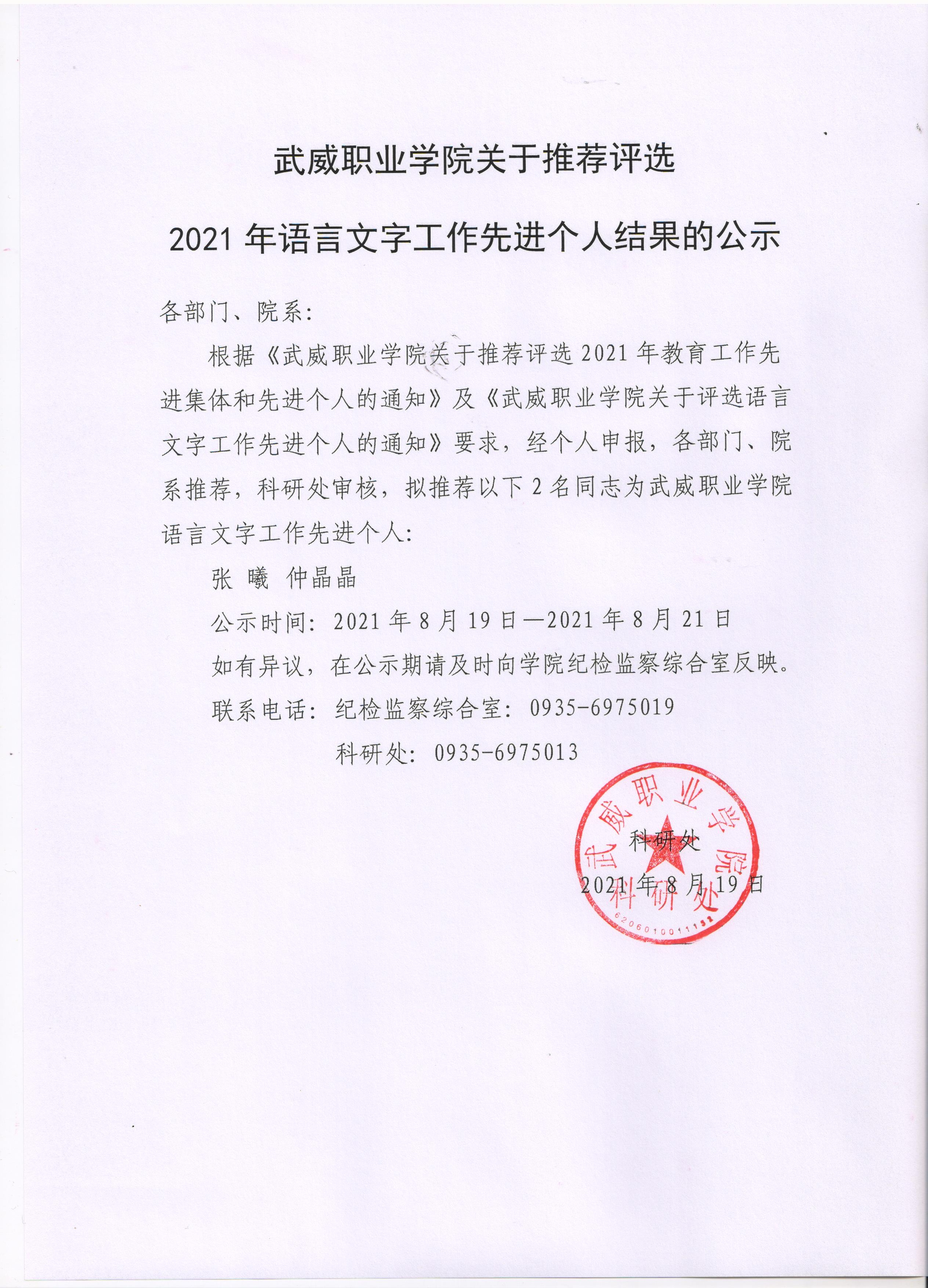 武威職業(yè)學(xué)院關(guān)于推薦評選2021年語言文字工作先進(jìn)個(gè)人結(jié)果的公示
