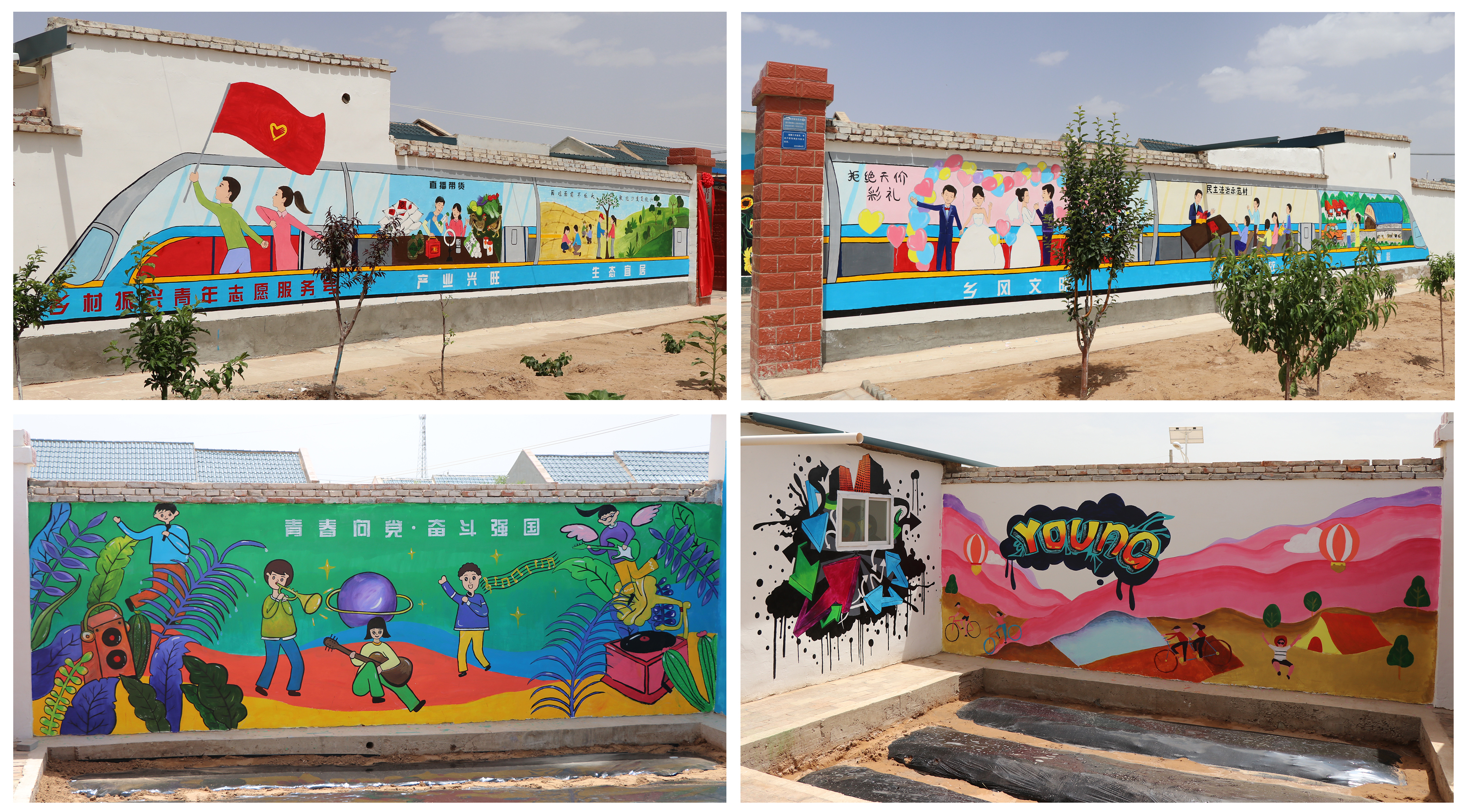 學院團委結(jié)合鄉(xiāng)村振興戰(zhàn)略和青年志愿服務工作特點對基地內(nèi)外墻體進行了彩繪設(shè)計,并組織人文藝術(shù)教育系師生完成了手工繪制。外墻以鄉(xiāng)村振興青年志愿服務號高速列車為主題,融入了鄉(xiāng)村振興戰(zhàn)略20字方針,產(chǎn)業(yè)興旺、生態(tài)宜居、鄉(xiāng)風文明、治理有效、生活富裕5個方面的總體目標。內(nèi)墻以青春時尚為主題,利用涂鴉的形式,展現(xiàn)青年人朝氣蓬勃、積極向上,青春向黨、奮斗強國的精神風貌。