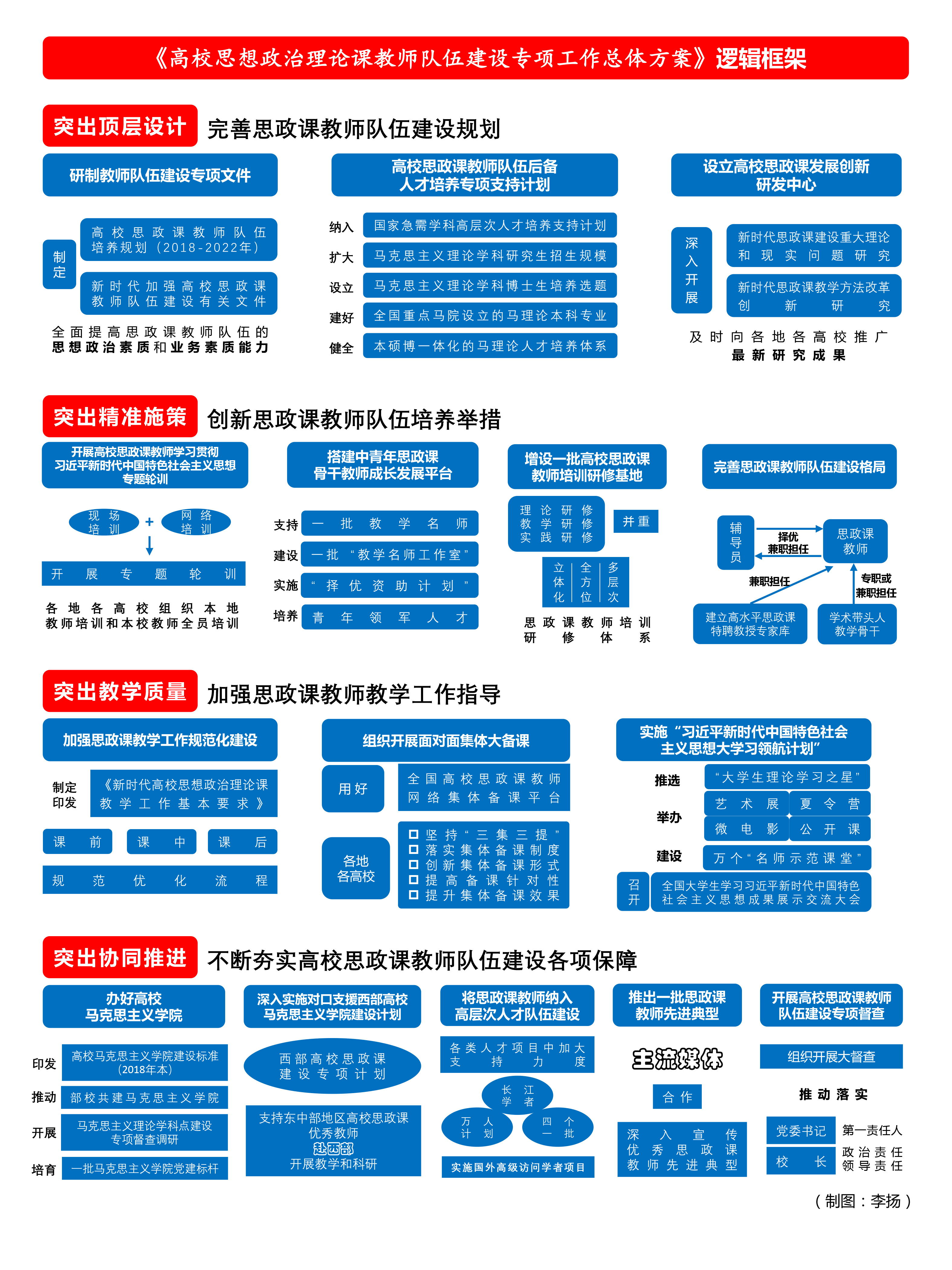 為全面推動(dòng)習(xí)近平新時(shí)代中國特色社會(huì)主義思想進(jìn)教材進(jìn)課堂進(jìn)學(xué)生頭腦,聚焦提升思政課教師綜合素質(zhì)和專業(yè)化水平,繼續(xù)打好提高高校思政課質(zhì)量和水平的攻堅(jiān)戰(zhàn),培養(yǎng)擔(dān)當(dāng)民族復(fù)興大任的時(shí)代新人,教育部決定2018年實(shí)施高校思想政治理論課教師隊(duì)伍建設(shè)專項(xiàng)工作,并于日前印發(fā)了工作總體方案。