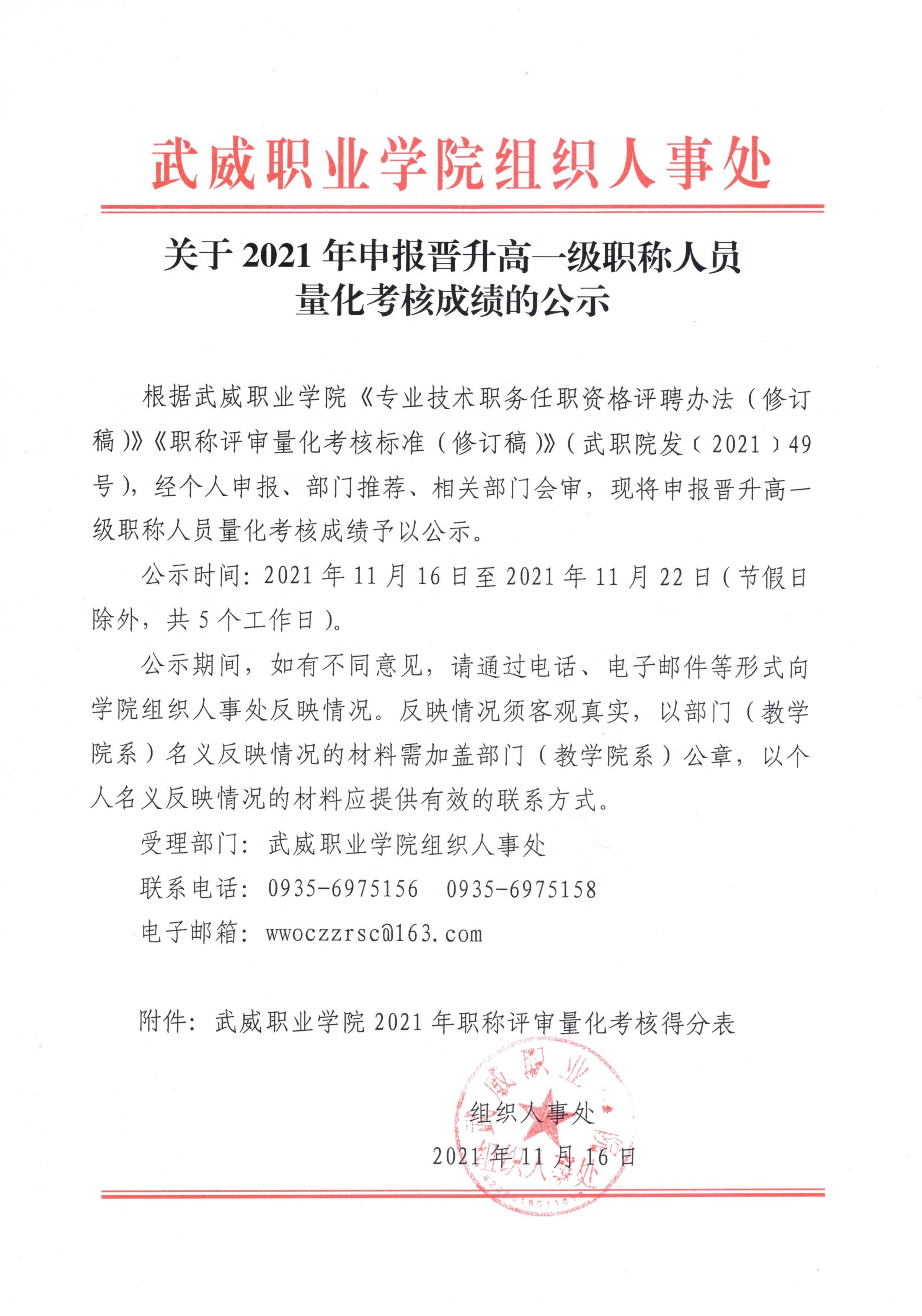 關(guān)于2021年申報(bào)晉升高一級(jí)職稱人員量化考核成績(jī)的公示