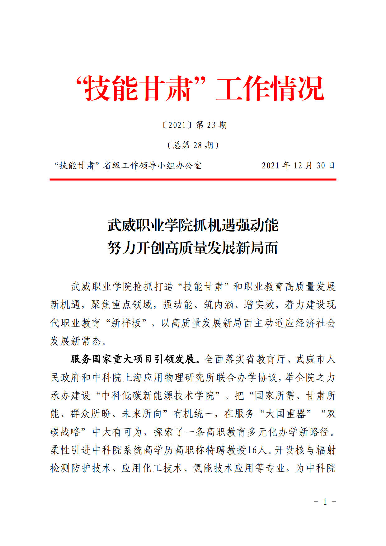 技能甘肅工作情況第28期:武威職業(yè)學(xué)院抓機(jī)遇強(qiáng)動能努力實(shí)現(xiàn)高質(zhì)量發(fā)展