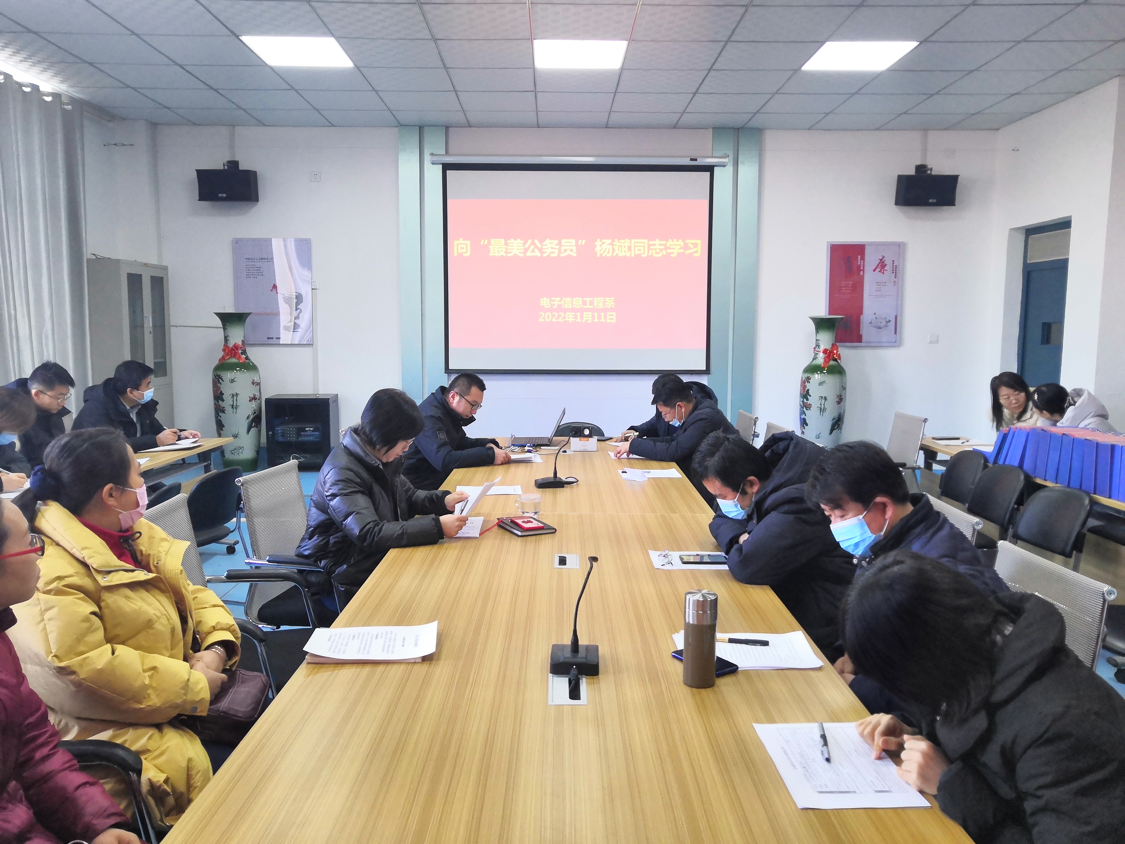 1月11日,電子信息工程系組織全體教師學(xué)習(xí)“最美公務(wù)員”楊斌同志先進(jìn)事跡。