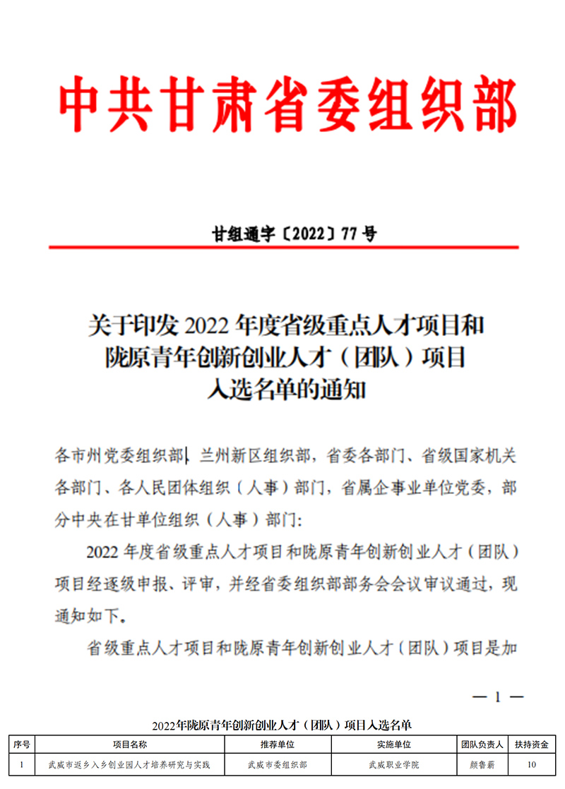 近日,省委組織部公布了2022年度省級重點(diǎn)人才項(xiàng)目和隴原青年創(chuàng)新創(chuàng)業(yè)人才(團(tuán)隊(duì))項(xiàng)目入選名單,我校顏魯薪老師主持的《武威市返鄉(xiāng)入鄉(xiāng)創(chuàng)業(yè)園人才培養(yǎng)研究與實(shí)踐》獲隴原青年創(chuàng)新創(chuàng)業(yè)人才(團(tuán)隊(duì))項(xiàng)目立項(xiàng)。