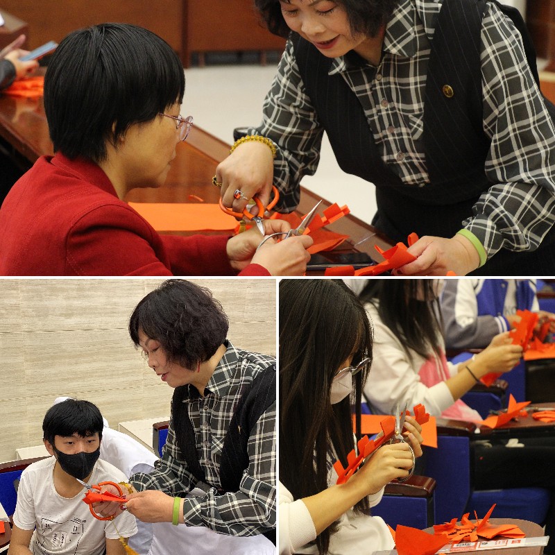 鄭霞從剪紙風格、剪紙技巧、剪紙原則等方面深入淺出地介紹了剪紙技藝的基本理論,并為學校捐贈了2幅剪紙作品,展示了16幅系列作品,得到師生一致好評。講座最吸引人的是動手實操環(huán)節(jié),鄭霞老師親身傳藝,為與會的師生展示了五星、喜字、窗花等的剪法,與會者興致勃勃地參與其中,喜悅與驚呼隨著作品一起迸發(fā)。許多學生表示,剪紙藝術很有魅力,愿意跟隨鄭霞老師學習技藝,做中華文明的傳承者。